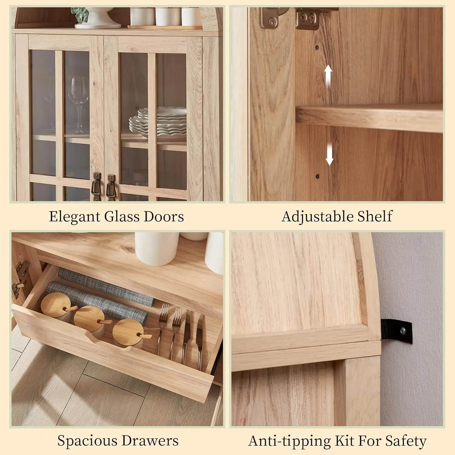 - Adjustable Shelves:the adjustable shelfs of this cupboard offers versatile organization options, allowing to customize the height and spacing according to needs.This feature accommodates items of varying sizes, from tall glassware to smaller dishes, ensuring efficient use of space.