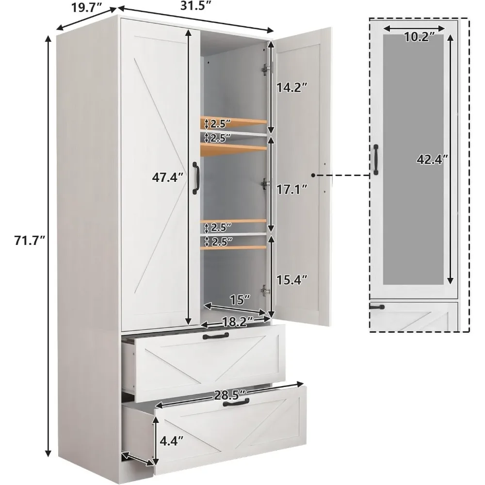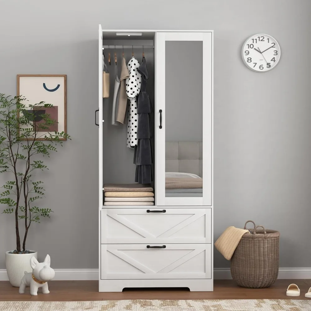 - 【STYLISH & PRACTICAL DESIGN】- Infuse rustic charm into your bedroom with this farmhouse-inspired armoire. The mirrored door adds a touch of elegance, while the automatic sensor light, which activates upon opening and shuts off when closed, enhances both functionality and convenience by providing a well-lit dressing area.