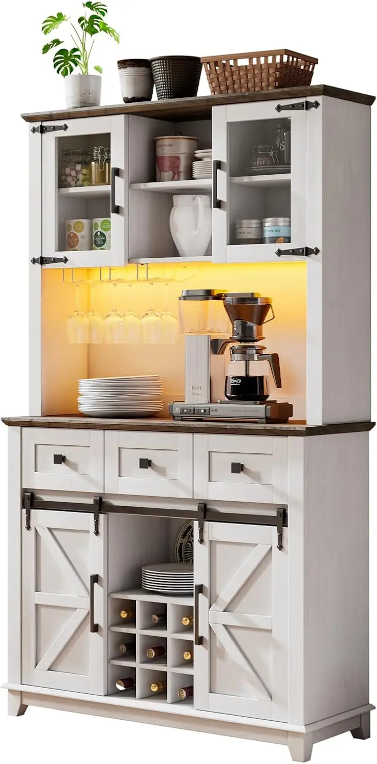 - [Double LED Strips] The coffee bar cabinet with double LED strips for 6 brightness, breathing, and instant night modes creates a home charming. With the gradient in the atmosphere, lighting illuminates the hanging glasses and tableware.