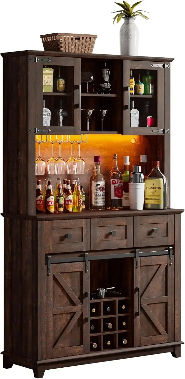 - [Double LED Strips] The coffee bar cabinet with double LED strips for 6 brightness, breathing, and instant night modes creates a home charming. With the gradient in the atmosphere, lighting illuminates the hanging glasses and tableware.