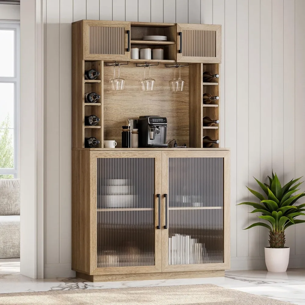 - [Multiple Uses] – This buffet cabinet with hutch adds elegance to your kitchen, dining room, living room, pantry, or lounge. It serves as a tall liquor cabinet, bar cabinet, sideboard, or regular kitchen hutch, enhancing the ambiance with its exquisite design. The door handles and tempered glass elevate its aesthetic appeal, making this wine bar cabinet a stylish addition to your home.