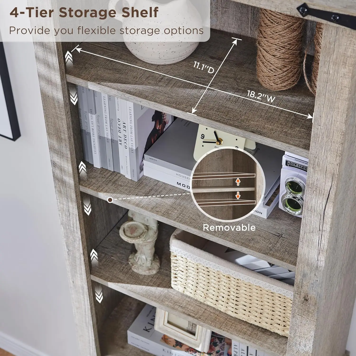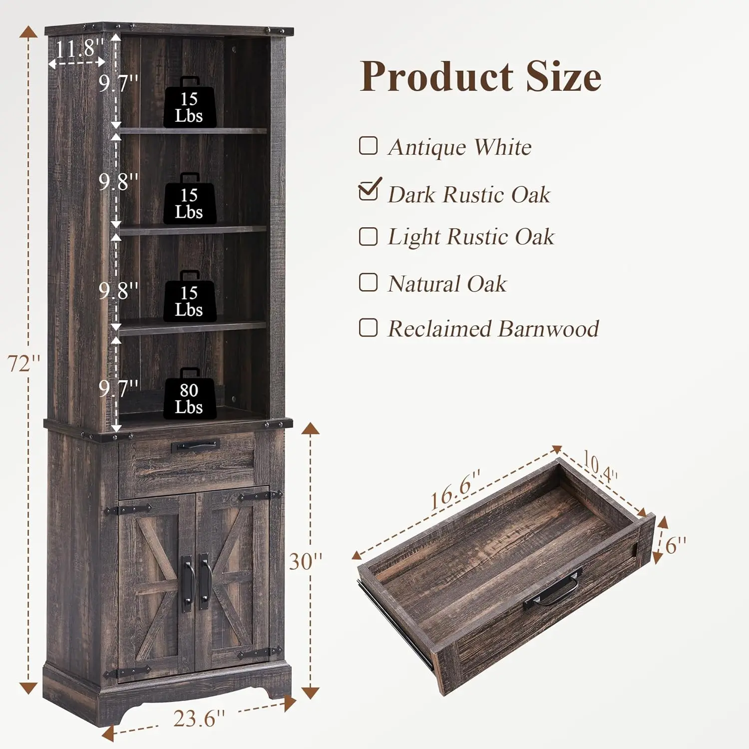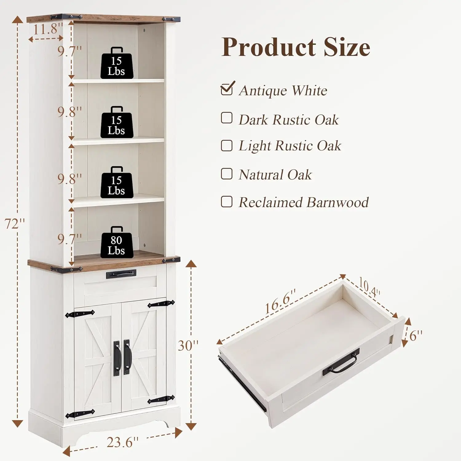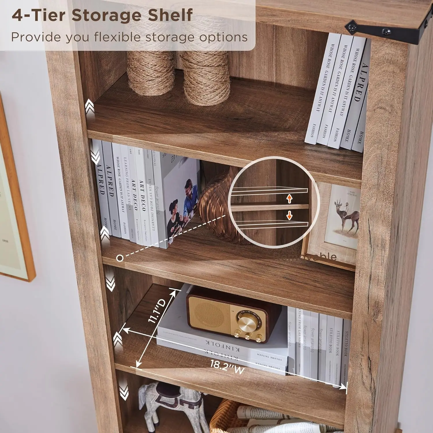72″ Tall Farmhouse Bookcase with Adjustable Shelves and Barn Door, 4 Tier Office Wood Bookshelf with Drawer for Office Library