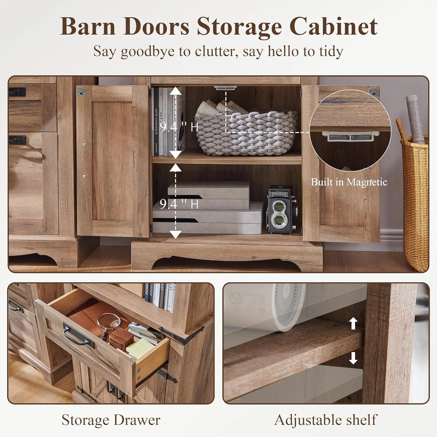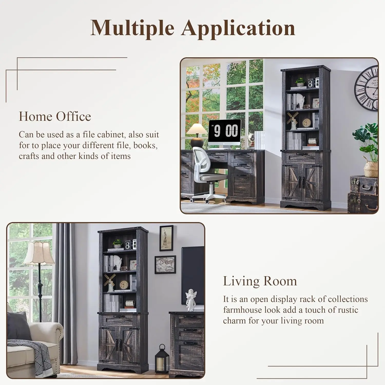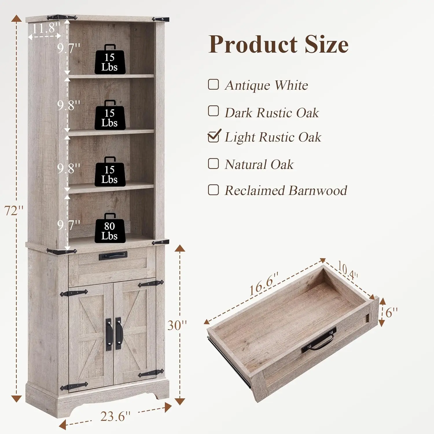 72″ Tall Farmhouse Bookcase with Adjustable Shelves and Barn Door, 4 Tier Office Wood Bookshelf with Drawer for Office Library