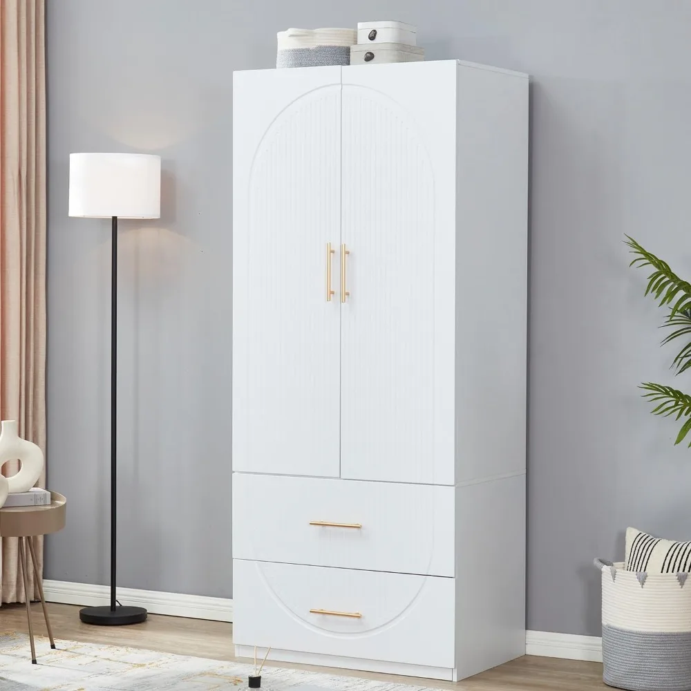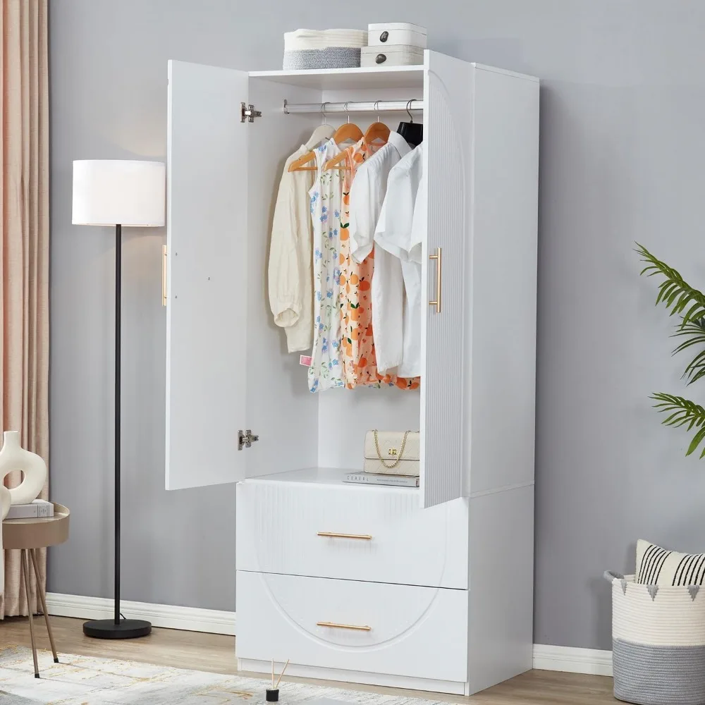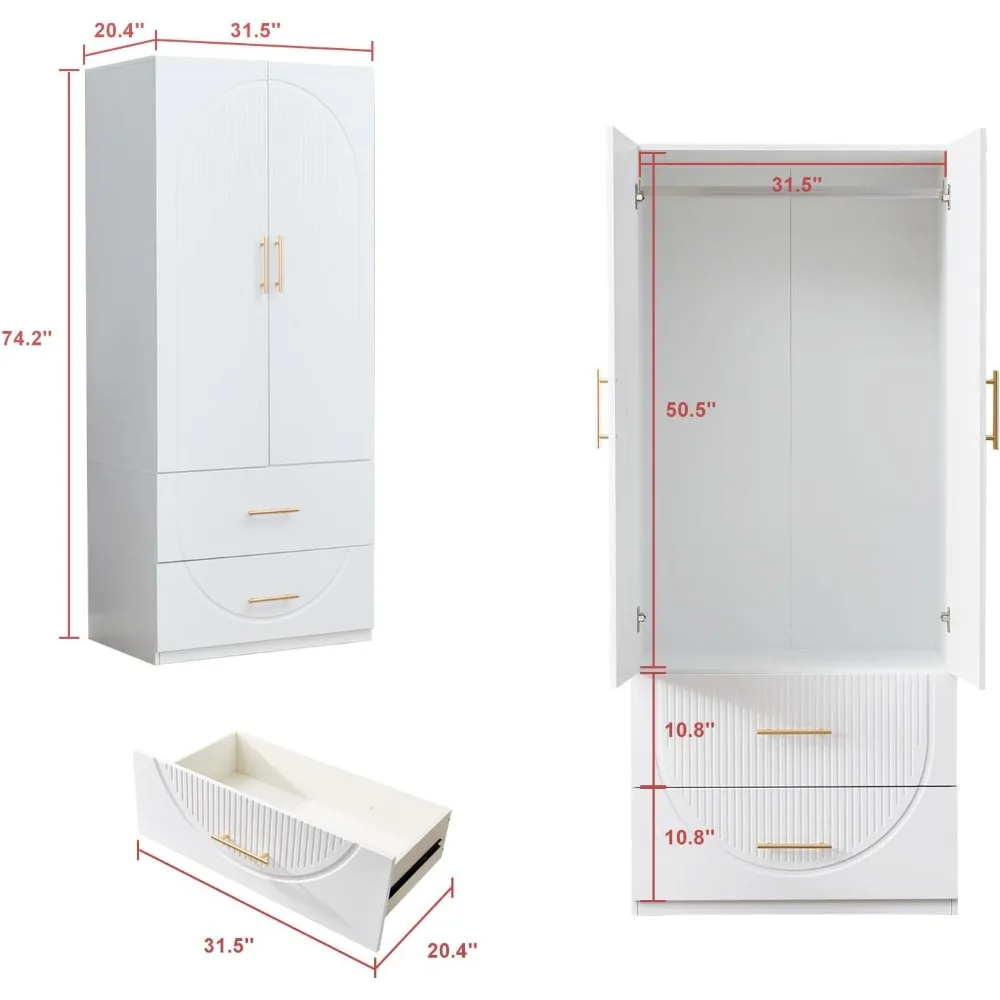 74.2″ Tall 2 Doors Wardrobe Closet 2 Drawers Wood Bedroom Closet Wardrobe Armoire Cabinet White Freestanding Wardrobe