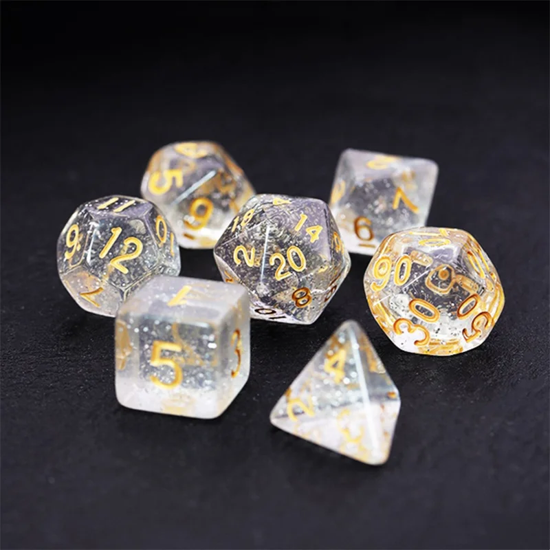 7Pcs Transparent Bling Gold Polyhedral Dices Set D4, D6, D8, D12,D20, D10 for Board Game Role Playing Game Party