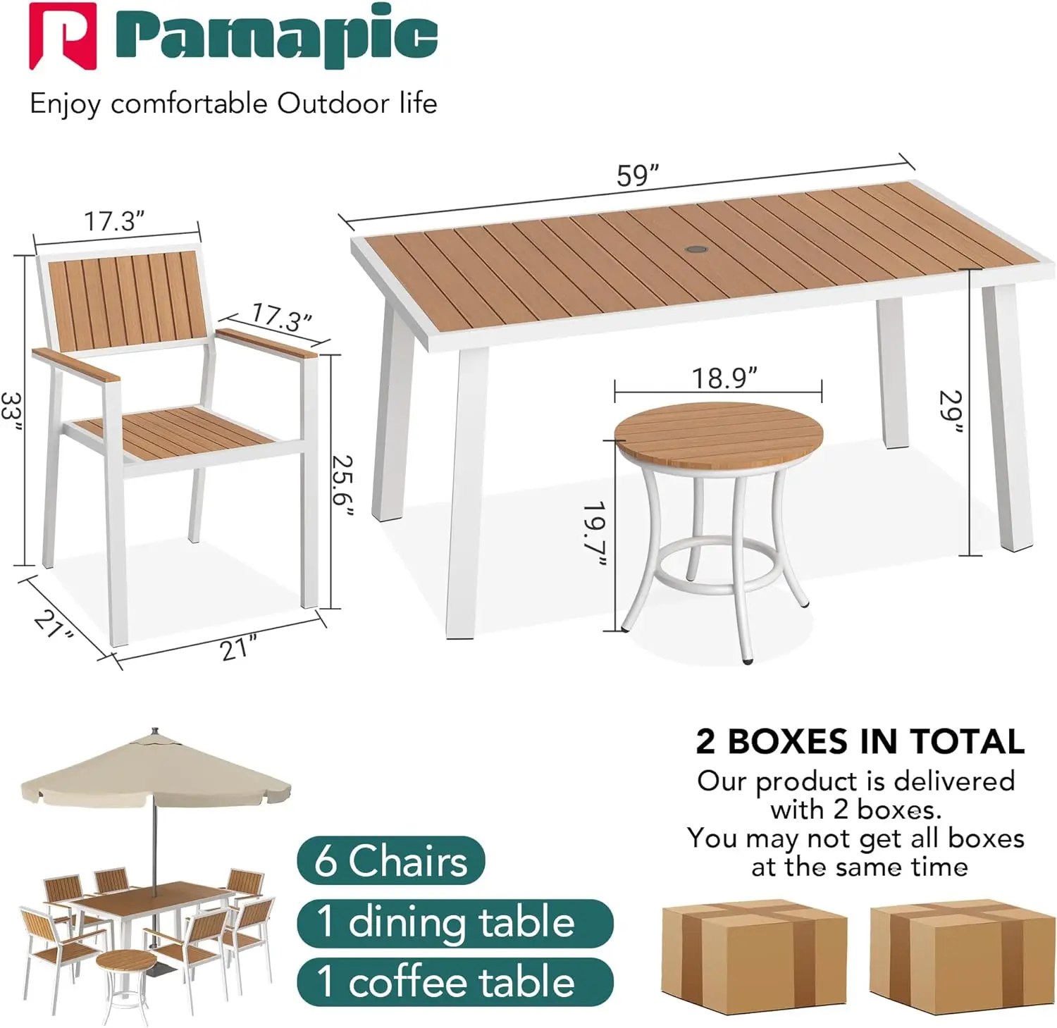 • 【Package Details】The patio furniture set contains six chairs, one dining table and one coffee table.Our product is delivered with 2 boxes. You may not get all boxes at the same time. We recommend assembling the set after receiving all boxes. Chair weight capacity is 220 lbs, dining table weight capacity is 66 lbs, and coffee table weight capacity is 44 lbs.