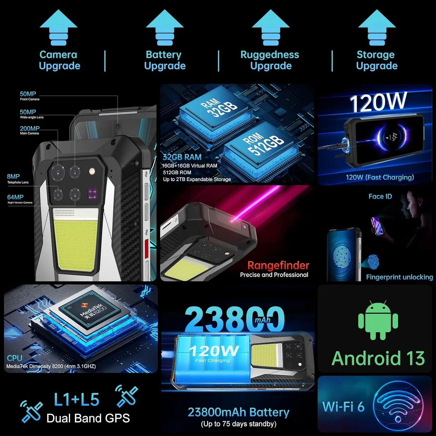 【23800mAh Battery & 120W Fast Charging】8849 Tank 3 5G rugged smartphone unlocked is equipped with 23800mAh battery, let you say goodbye to frequent charging. It can standby for 1800 hours. Tank 3 outdoor rugged phone can also work as a power bank to charge other smartphones or device by OTG cable. Not only that, 120W fast charging to finish 90% charged about 1.5 hours. Whether it's playing games or watching videos, you don't worry about your phone running out of battery