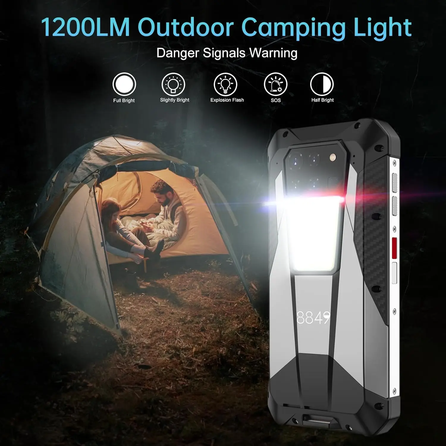 【1200LM Powerful Camping Light】8849 Tank 3 unlocked rugged android phones equipped with 1200LM camping light capable of illuminating a vast area up to 98ft, providing a reliable light source to your outdoor pursuits. With 5 different modes(including SOS, explosion flash, slightly bright, full light, and half light), 8849 waterproof 5G rugged cell phones unlocked is a best choice for journey, outdoor and travel; Not only that, tank 3 rugged smartphone add warning signal lights for emergency use