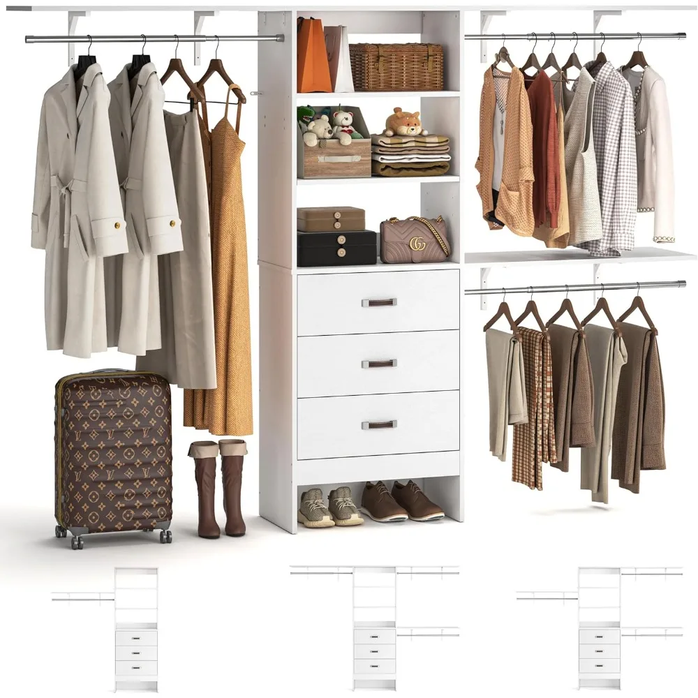 8FT Closet System, 96” Closet Organizer System with 3 Hanging Rods, Wall Mount Bedroom Wardrobe with 3 Drawers Walk-in Closet