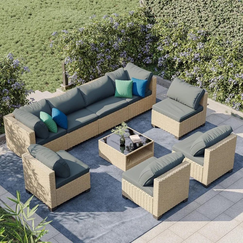 9-Piece Patio Furniture Set, Outdoor Wicker Conversation Set Sectional Sofa with Waterproof Thick Cushions and Coffee Table