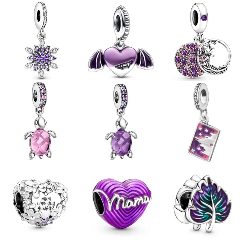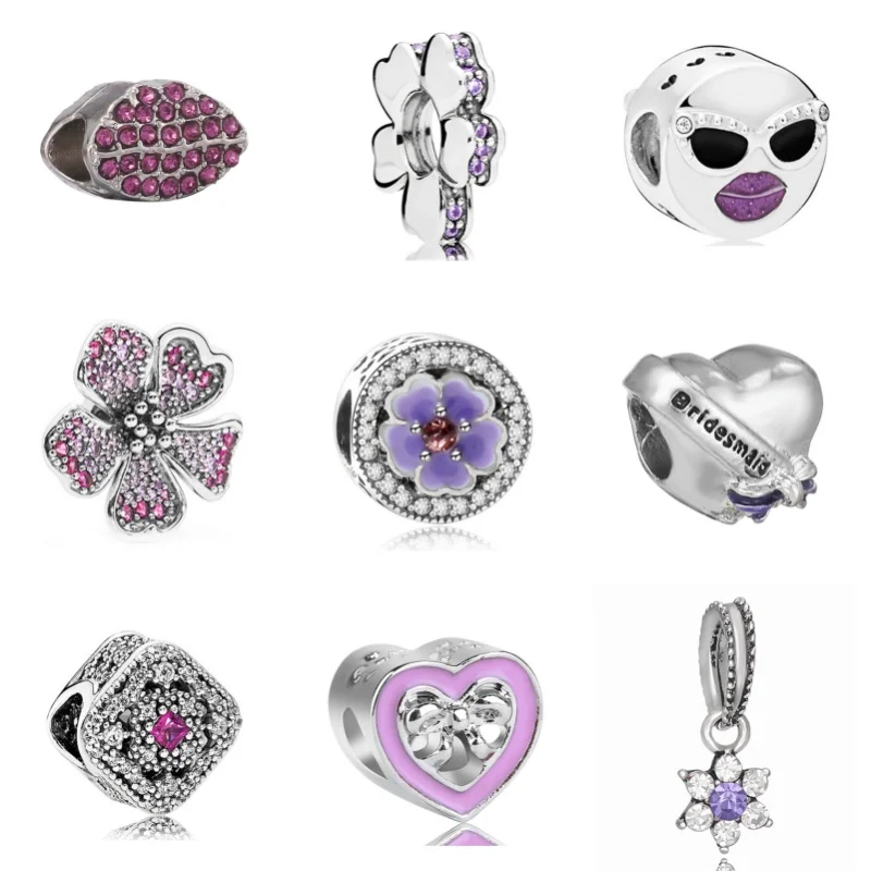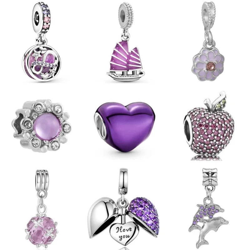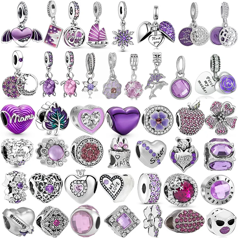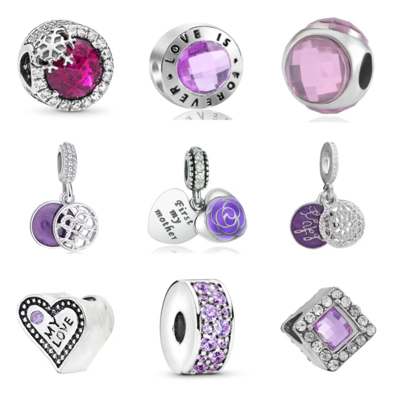 925 Silver Plated Purple Love Heart Feather Diamonds Charms Beads For Pandora Bracelets Necklace DIY Jewelry Accessories Gifts
