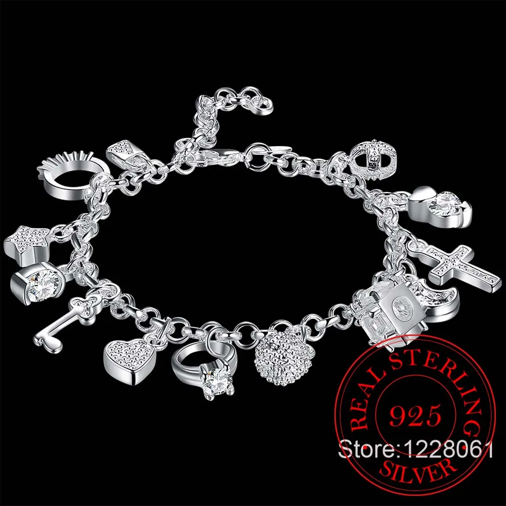 925 sterling silver 13 charms Cross Lock Key Heart Star Moon Flower Zircon bracelet bangle women’s fine jewelry Accessories