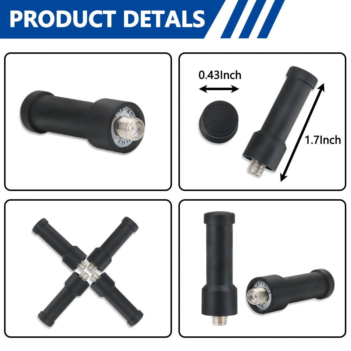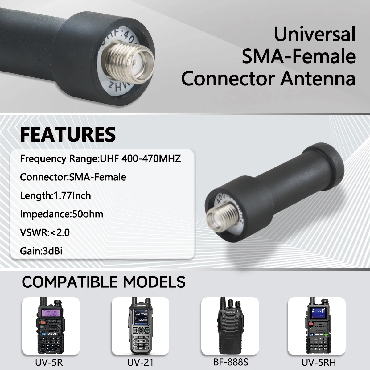 【Specification】Connector: SMA-Female Frequency Range: UHF 400-470MHz; Gain: 3dBi; V.S.W.R:2dBi; Max Input Power: 20W; Impedance: 50 ohm; Length:1.7inch.Fits UHF FRS Handheld Two Way Radio,Portable Walkie Talkies.