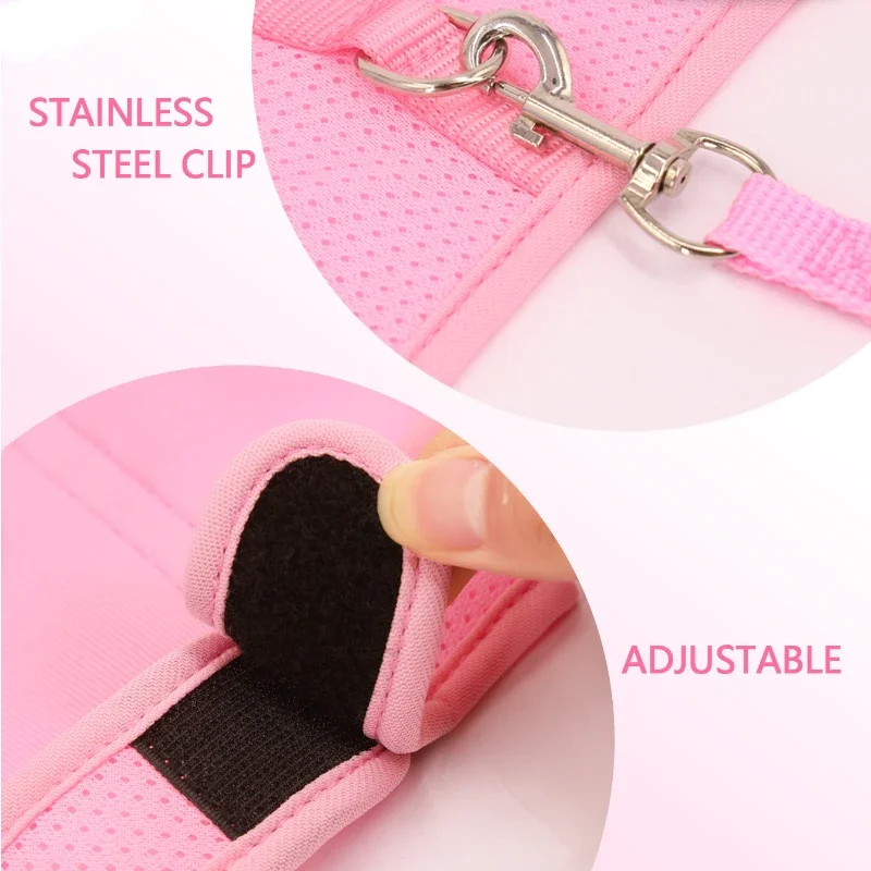 1. High Quality Material: Small animals harness and leash use durable polyester fibre material, soft and comfortable, suitable for hot and cold weather, with strong breathability, it will not cause pressure on the pet’s body, and it will not scratch the pet’s skin even if it is worn for a long time.