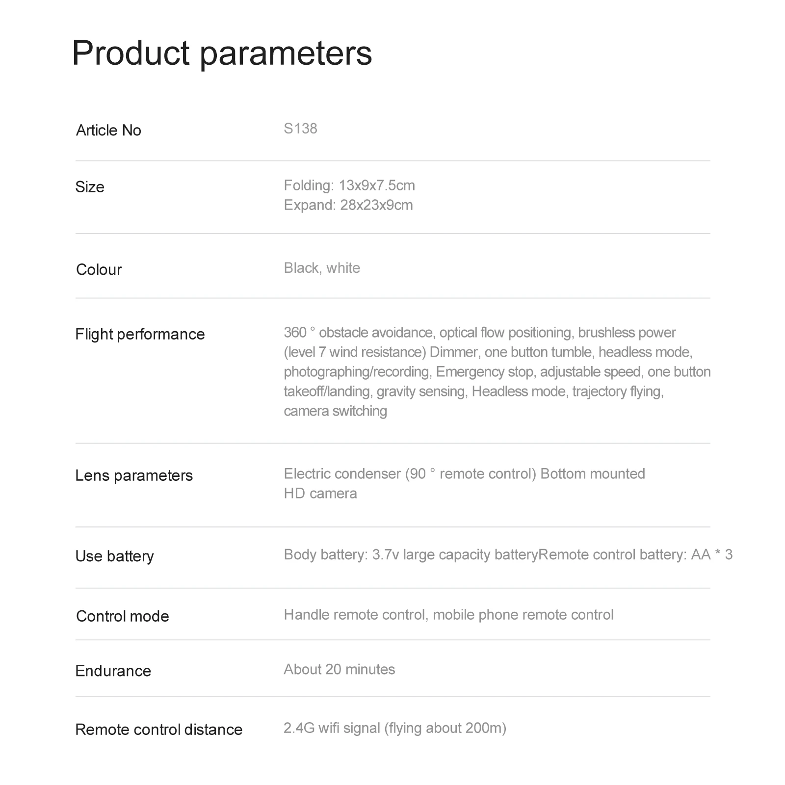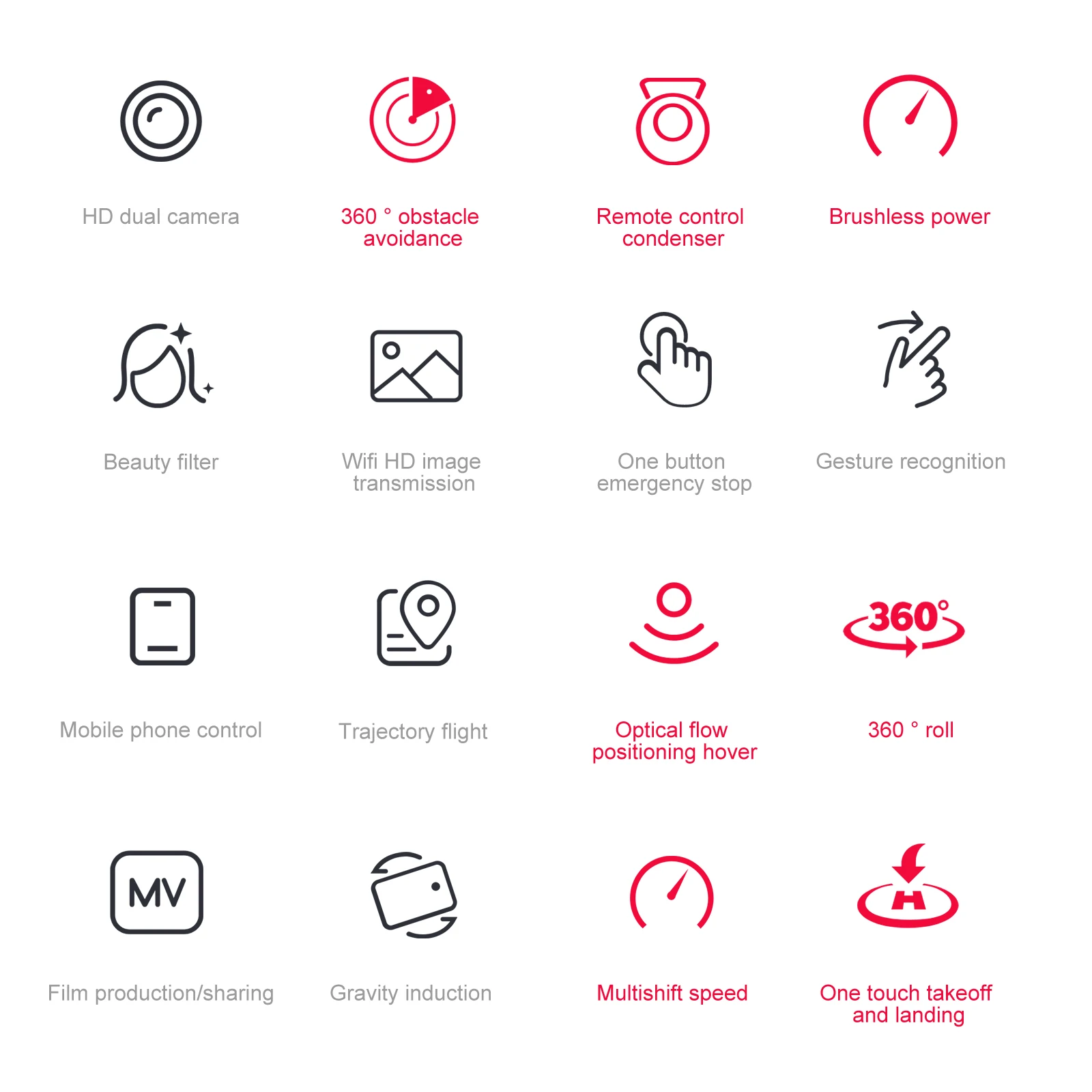 One-button start, brushless motor, 6-level wind resistance, obstacle avoidance on all sides, electrically adjustable camera, optical flow positioning, camera switching, aircraft folding, six-pass gyroscope; One button takeoff, one button landing, ascent and descent, forward and backward, left and right side flight, steering, headless mode, one button rollover, one button correction (with camera can add functions: Gesture photography, video recording, headless mode, emergency stop, trajectory flight, gravity sensing, automatic photography)