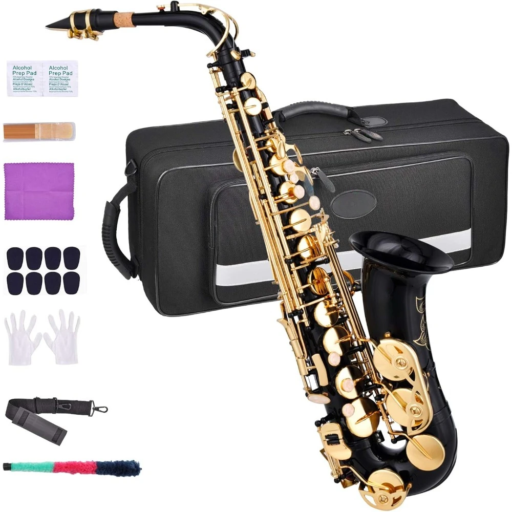 Alto Saxophone E Flat Sax Full Kit with Carrying Case,Mouthpiece,Mouthpiece Cushion Pads,Cleaning Cloth&Cleaning Rod