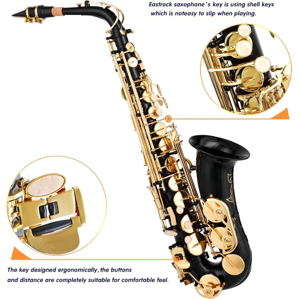 - 【Top Material】Our beautiful instrument used selected h68 copper material and multi-layer painted transparent lacquered black,durable and non-fading and Hand carved on the appearance and high-quality shell buttons make the sax more perfect. saxophone is definitely an outstanding musical instrument in terms of quality and appearance