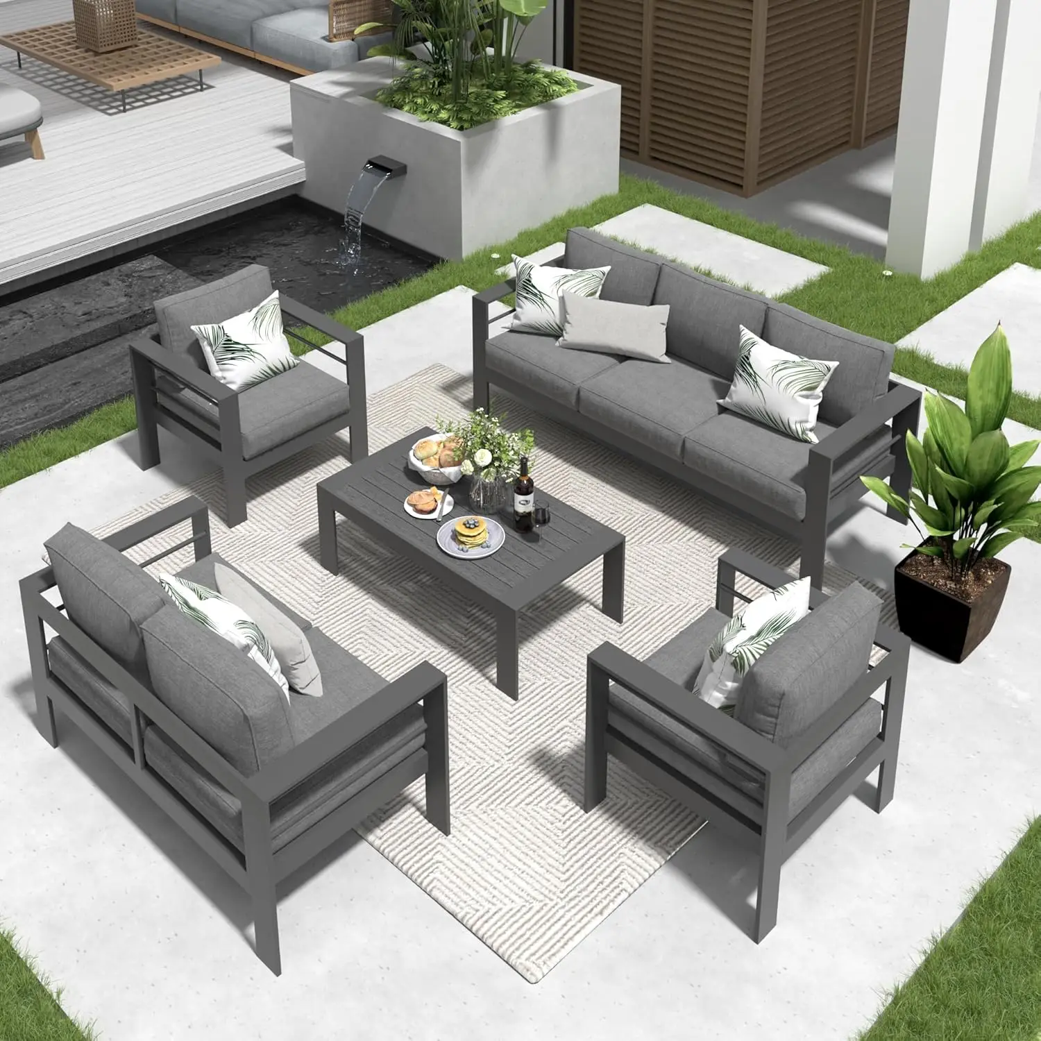 【Premium All-Aluminum Frame】This modern patio furniture set is made of a powder-coated aluminum frame that is both solid and durable while being lightweight. Unlike traditional iron/steel furniture, aluminum outdoor patio furniture is resistant to fading, rusting, and corrosion in all weather situations. It will serve you well for many years!