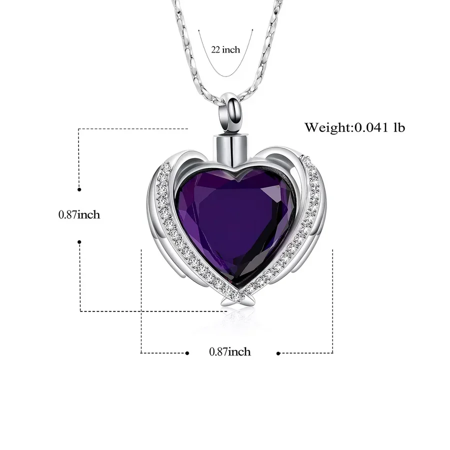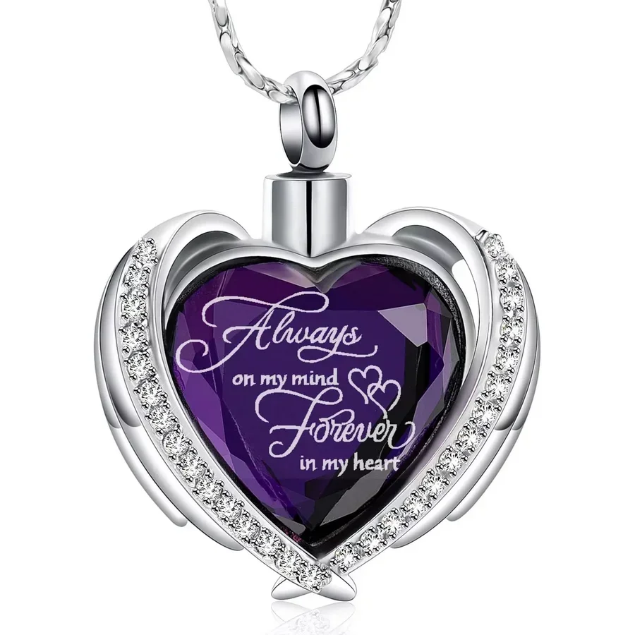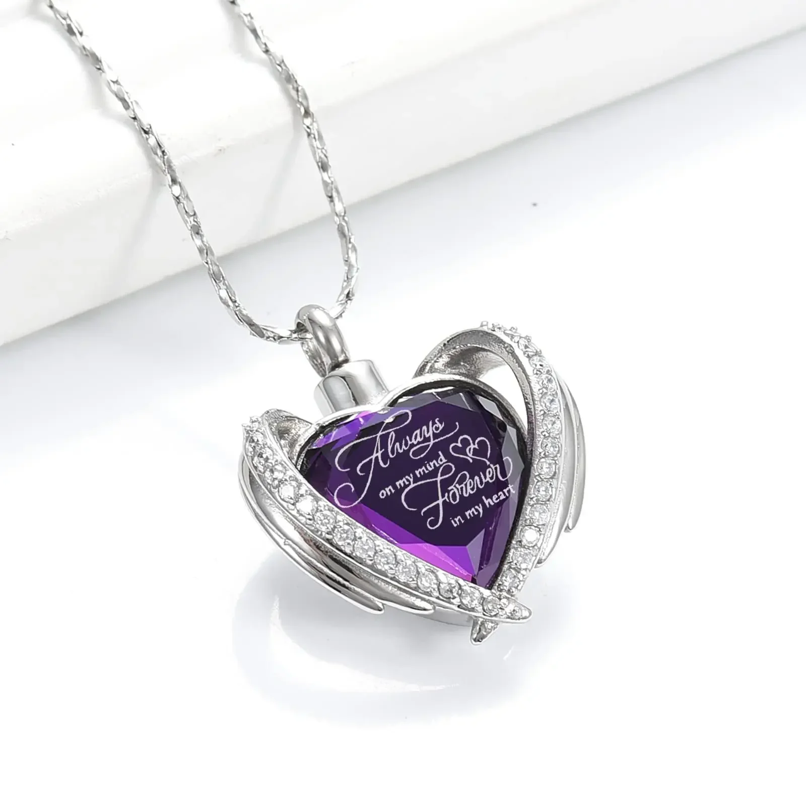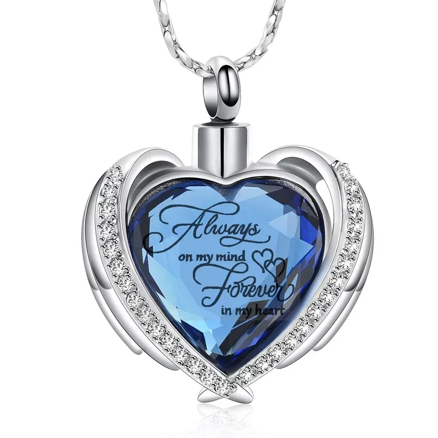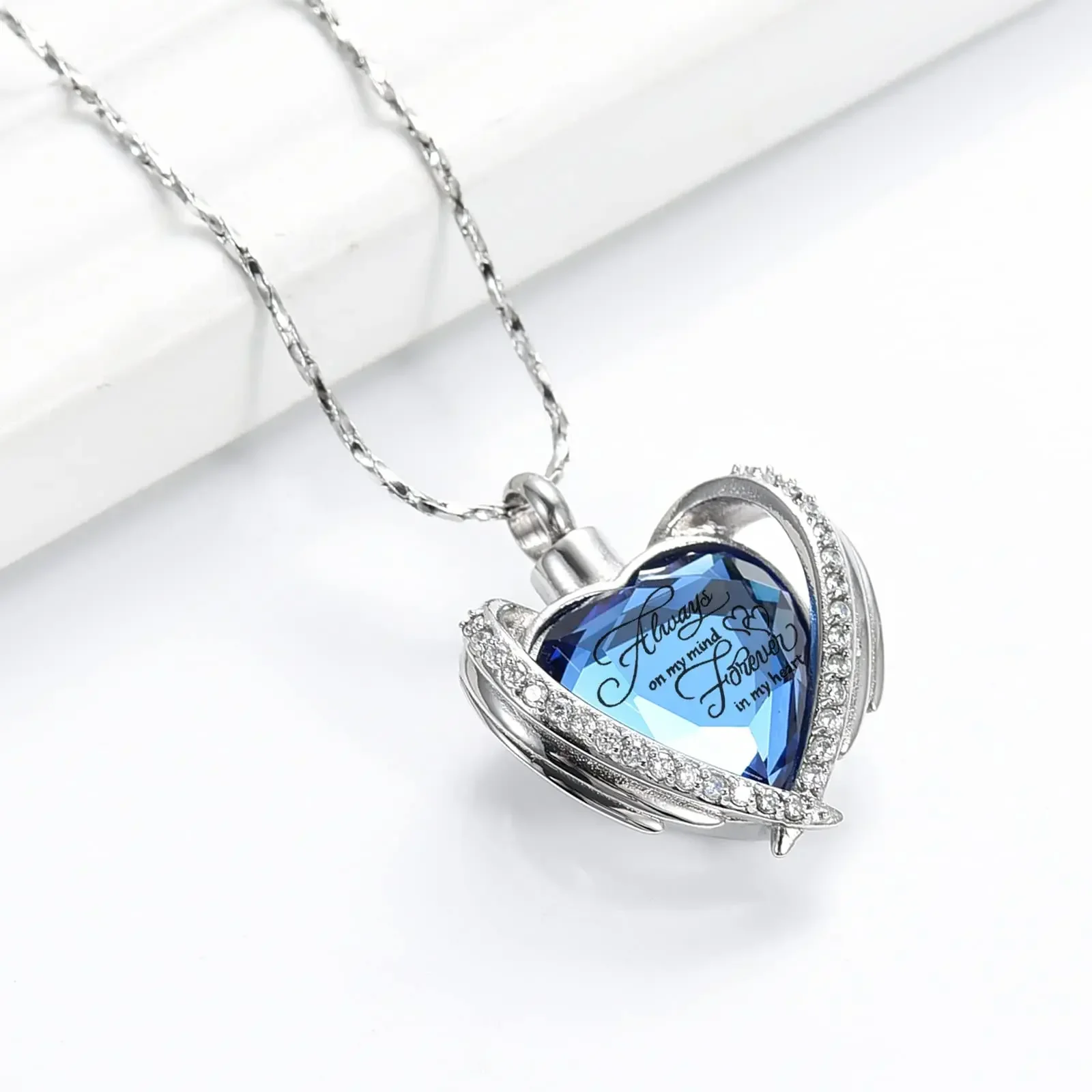 Always In My Mind Angel Wing Hug Crystal Heart Shape Necklace Cremation Pendant Memorial Ash Holder Urn Funeral Keepsake Jewelry