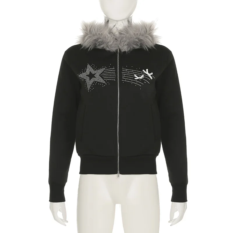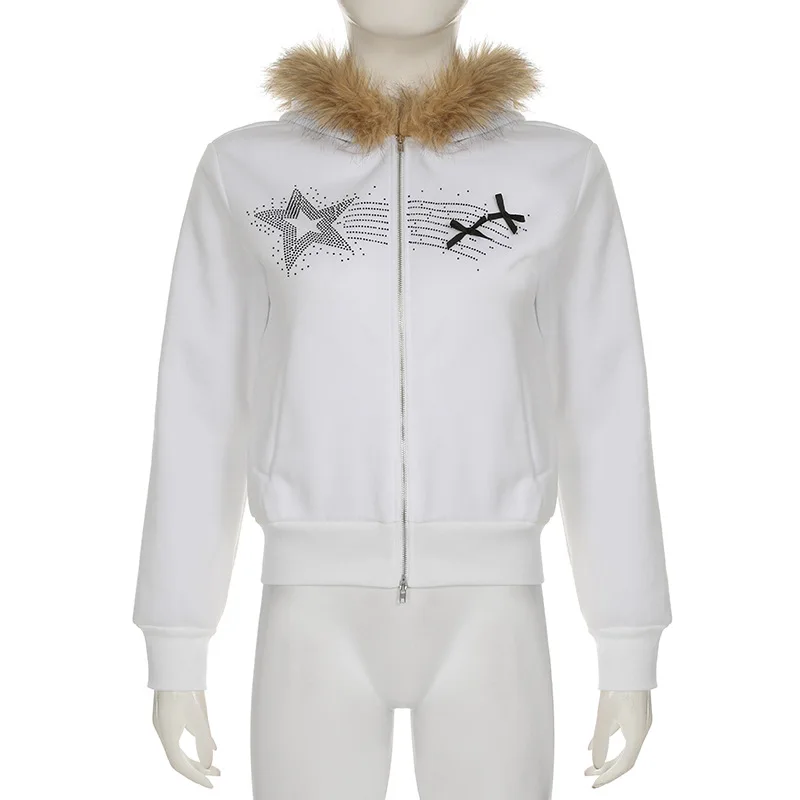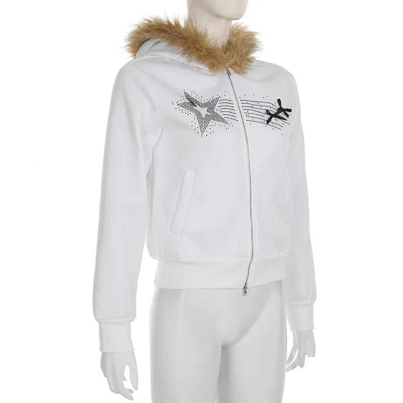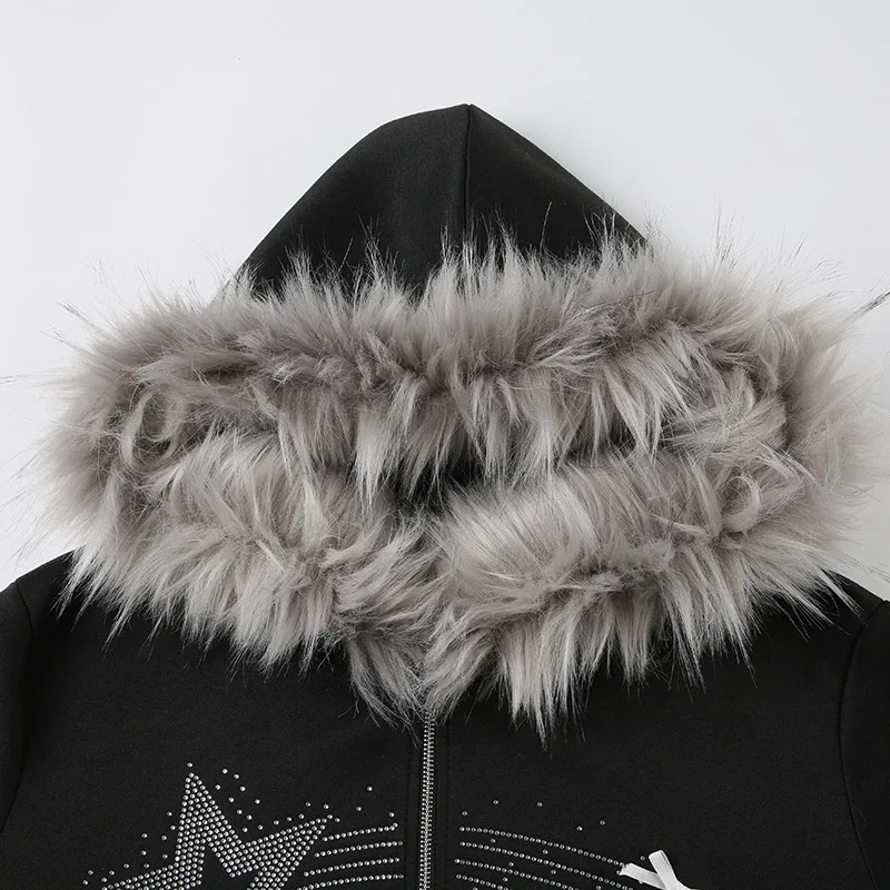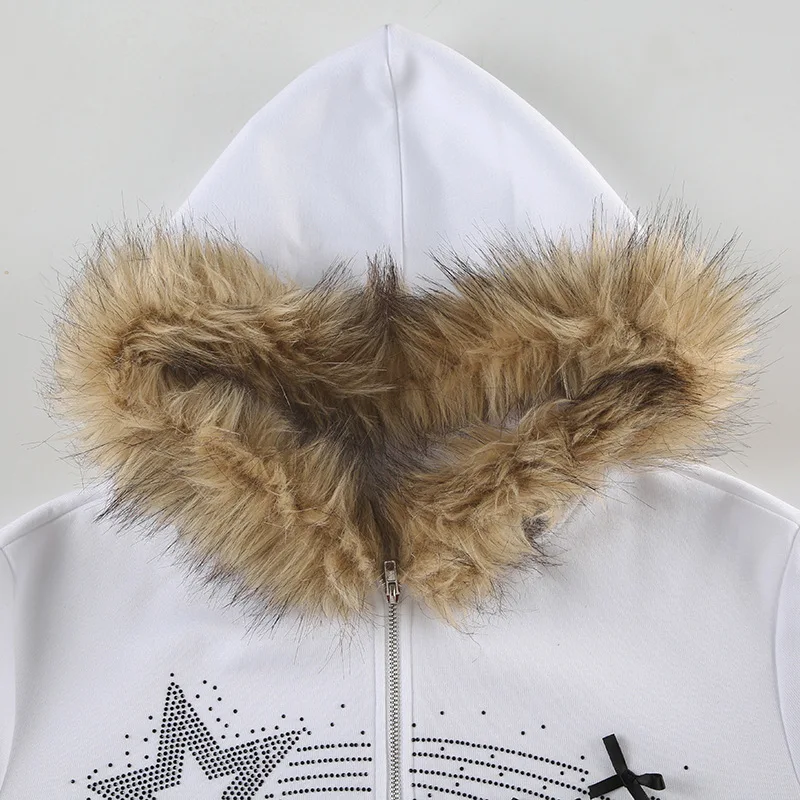 American Casual Loose Star Bow Double Zip Cardigan Hoodie Women’s Autumn Winter Fur Collar Hooded Coat Female Elegant Blouses