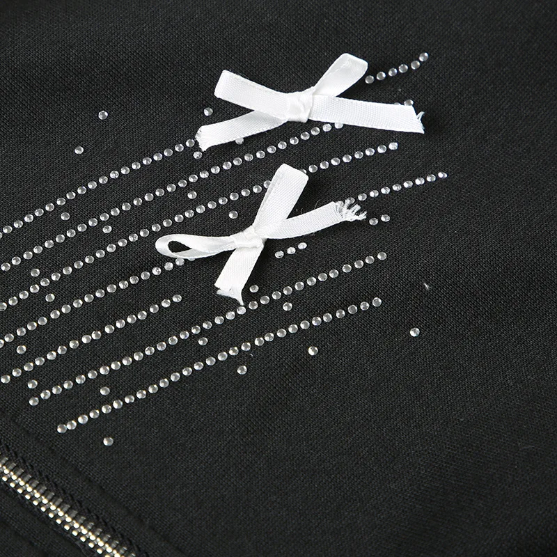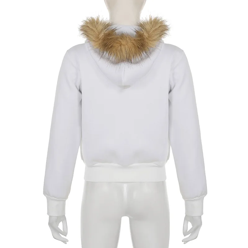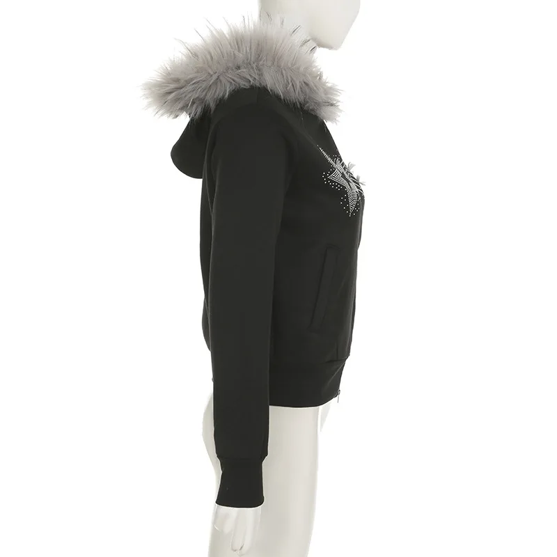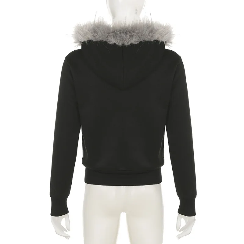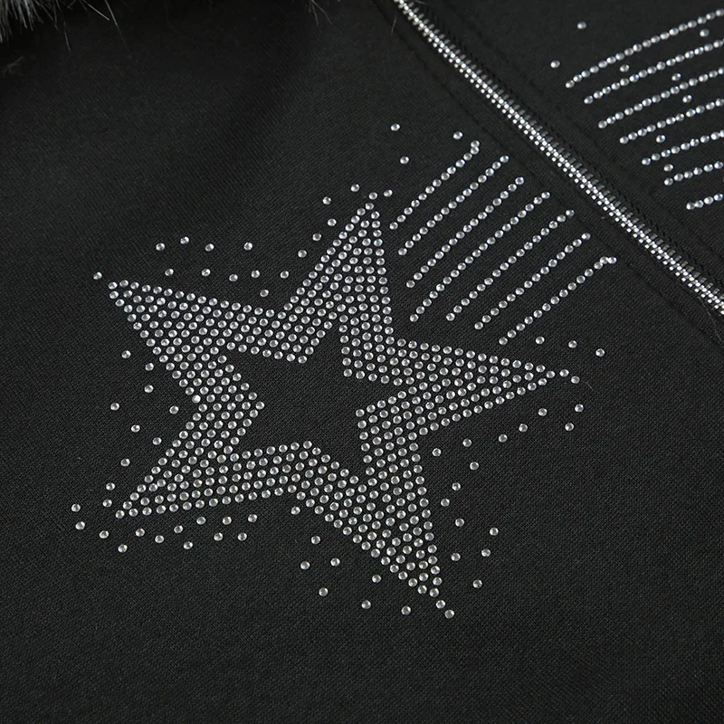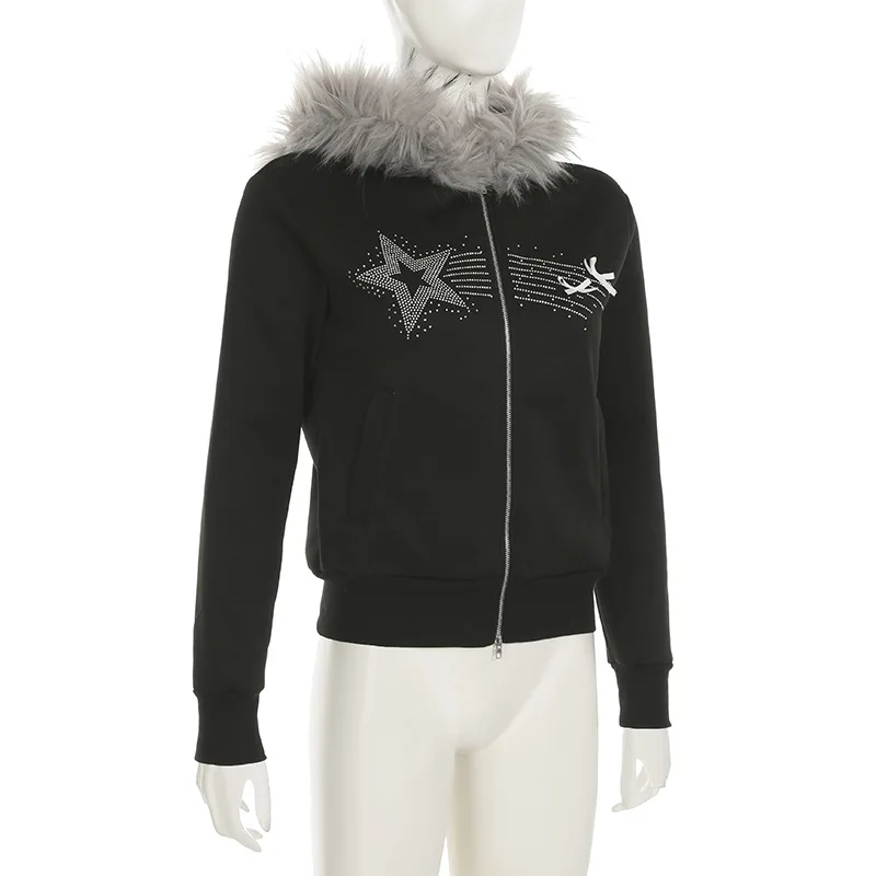 American Casual Loose Star Bow Double Zip Cardigan Hoodie Women’s Autumn Winter Fur Collar Hooded Coat Female Elegant Blouses