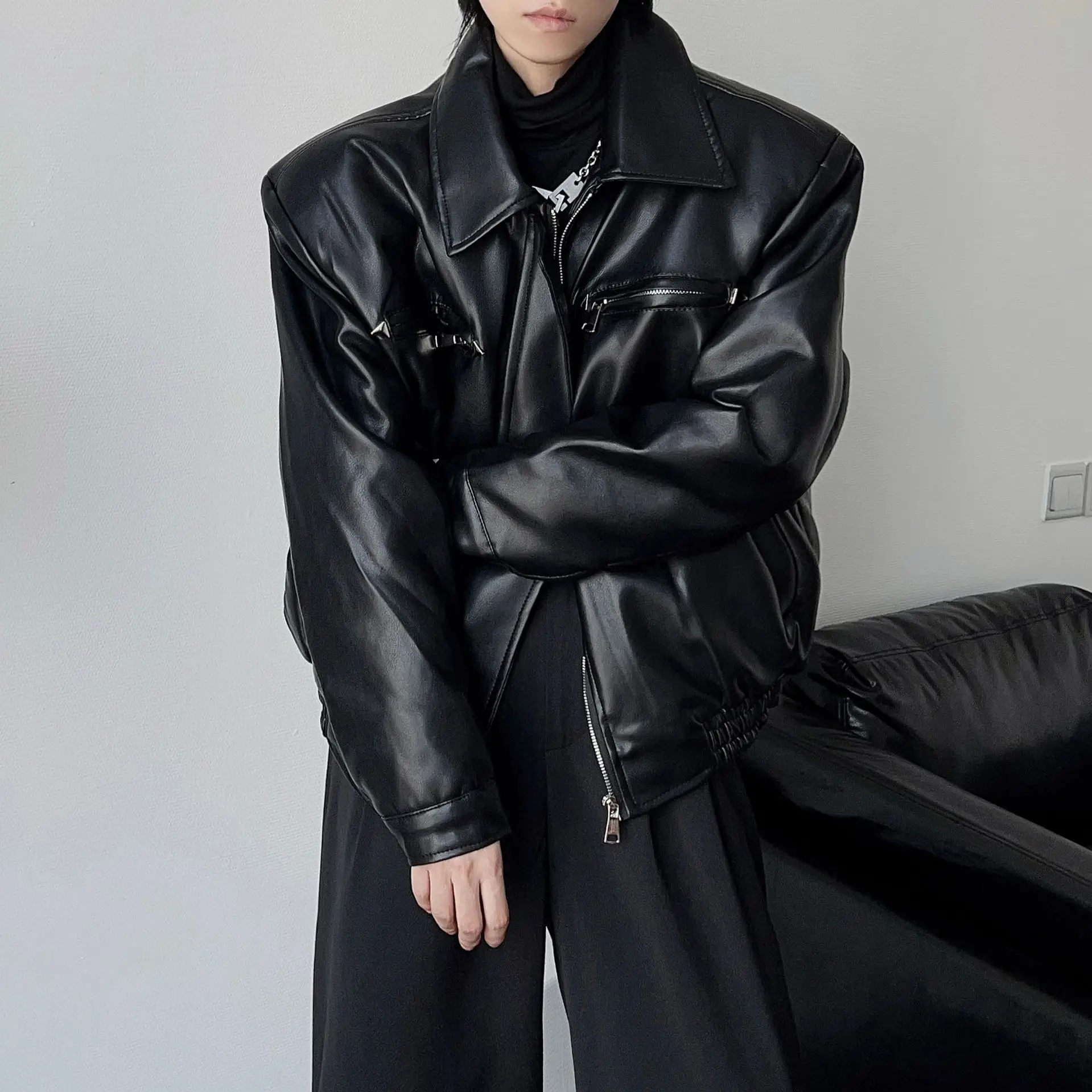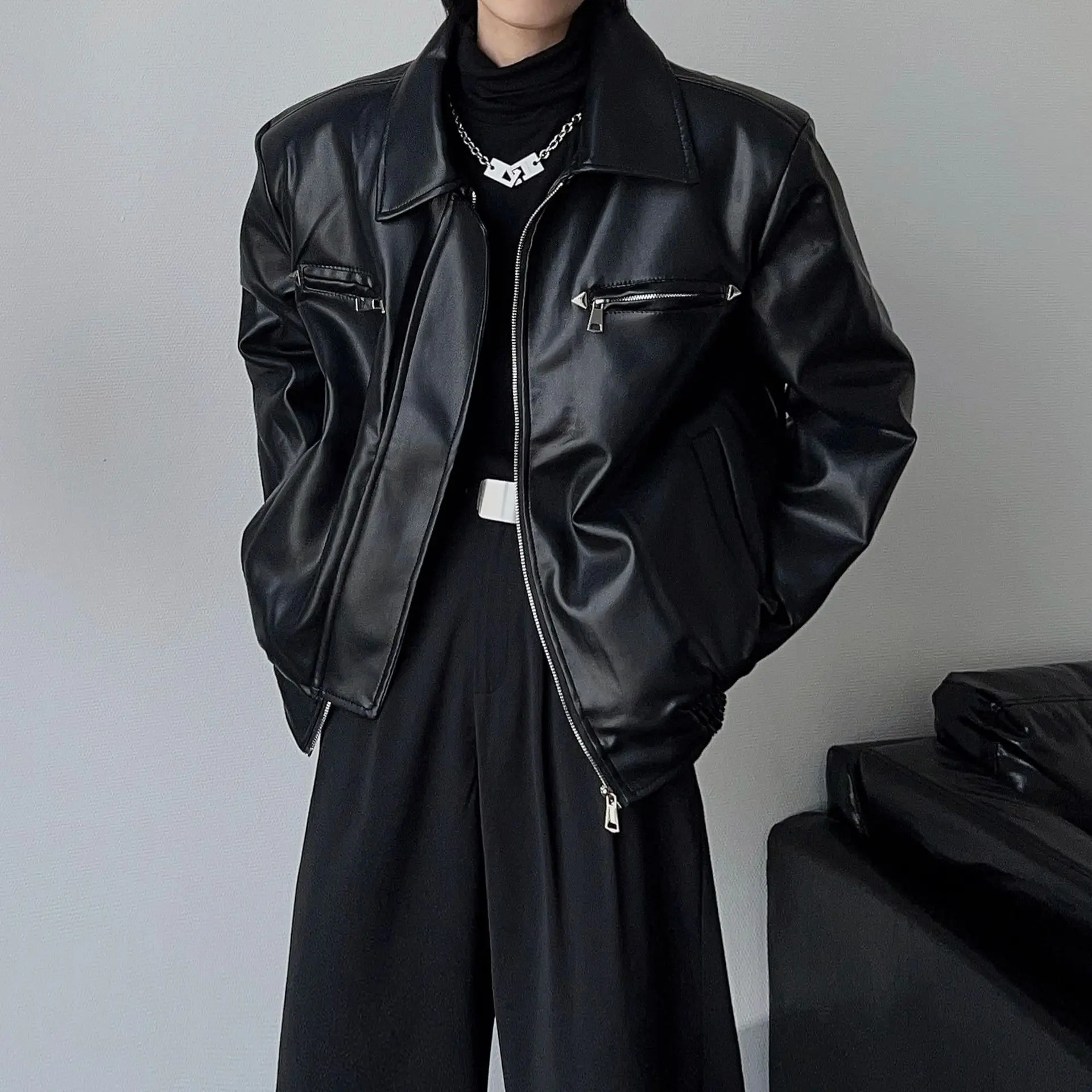 American PU Leather Jacket Men’s Spring and Autumn British Ruffian Men’s High-end Silhouette Locomotive Clothing Tooling Leather