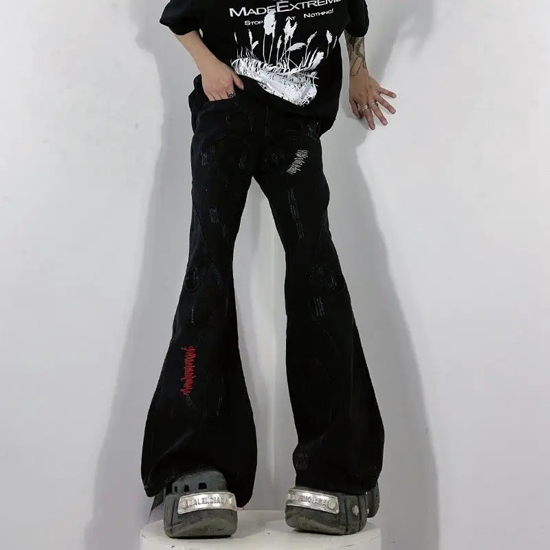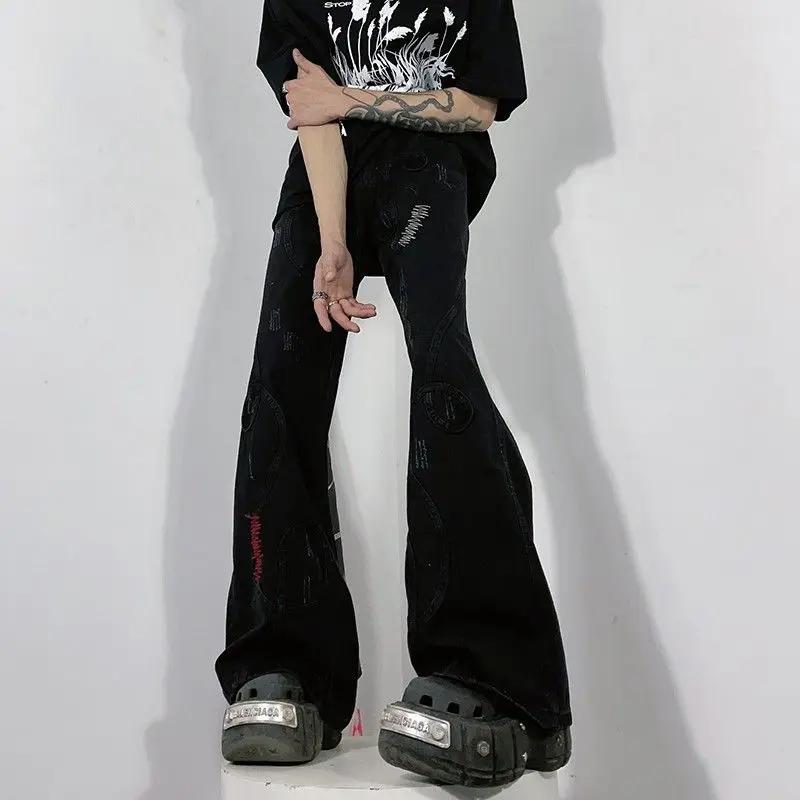 American retro personalized design splicing washed micro horn jeans men and women street loose wide leg drag casual pants y2k