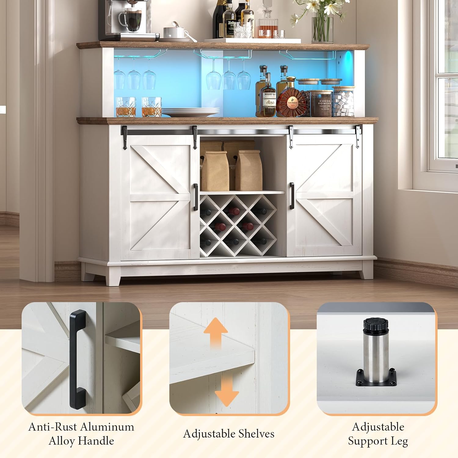 Amerlife 55″” Farmhouse Coffee Bar Cabinet With Led Lights, Buffet Cabinet With Storage & Wine Racks, Home Liquor Cabinet With