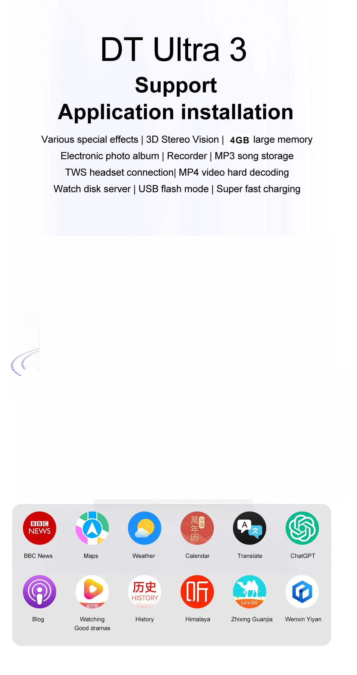 2 menu styles Supports over 200 dials (styles: practical, dynamic, numerical, distinctive, pointer, minimalist, landscape and nature) Multi sport modes Dial pad Activity Real sleep Real heart rate The weather Blood oxygen music. Breathing training AI voice Exercise records contacts. Call records Calculator. Voice memo: 9 types of games Alarm clock Stopwatch. Timer Flashlight. Search for mobile phone (connect to mobile phone for use) Camera (connected to mobile phone for use) Local photo album Video set up. Multiple games USB. Data transfer Multiple standby clocks Password protection Multiple 3D menu styles Power saving mode One link Quick components Information push Brightness adjustment Menu wallpaper settings AppStore (map, Netease Cloud, ERNIE Bot, etc.)