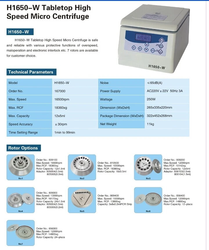 For H1650-W Tabletop High Speed Micro Centrifuge is safe and reliable with various protective functions of overspeed, maloperation and electronic interlock etc. 7 rotors are available for customer choice.