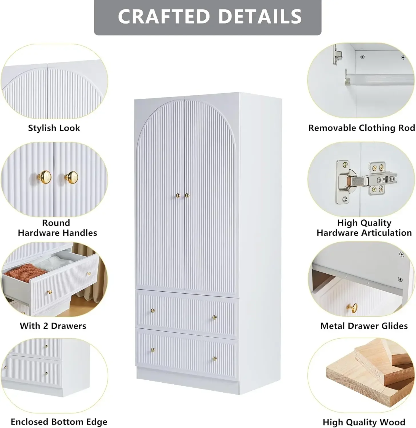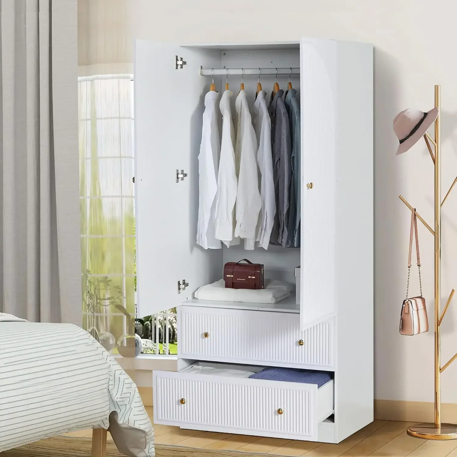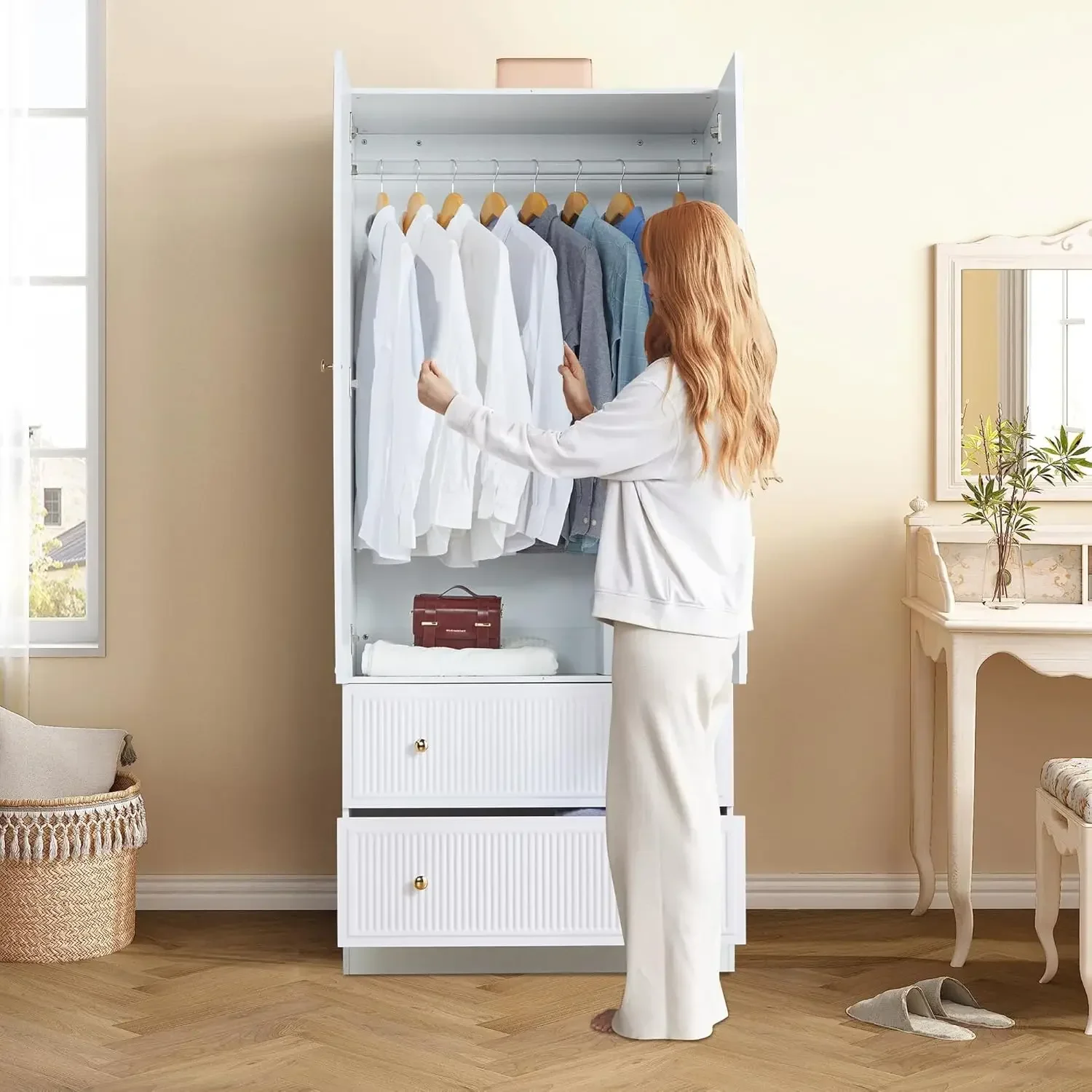 • 【SPACIOUS STORAGE SPACE】 This large wardrobe closet for bedroom with unique decorated drawer door and 2 storage drawers for storing clothes, blanket and organizing small objects, such as socks, underwear and so on. The armoire wardrobe closet with hanging rod is perfect to store longer clothes and dresses