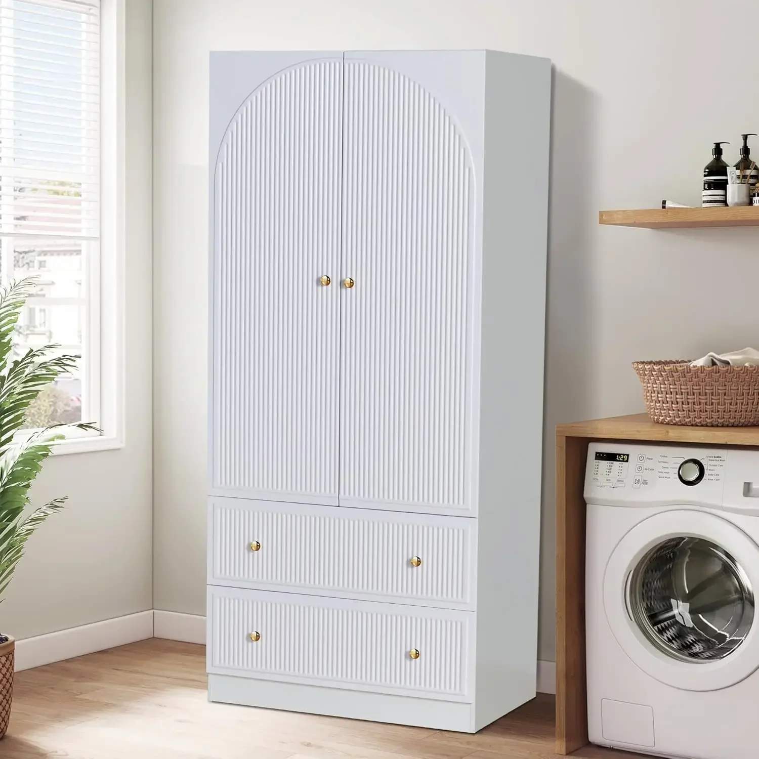 • 【ARMOIRE WARDROBE CLOSET】 The wardrobe is classic and simple wooden closet cabinet, it consist of elegant striped wood cabinet top, exquisite gold handle and minimalist wood base, cleverly matched with grain veneer and striped design, which brings a perfect visual effect