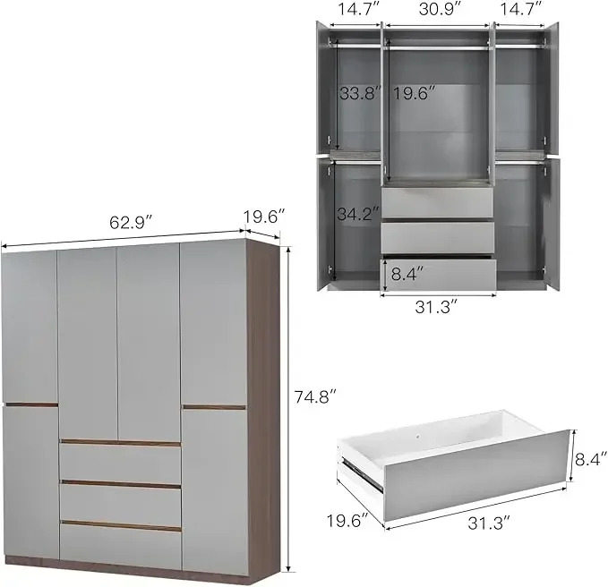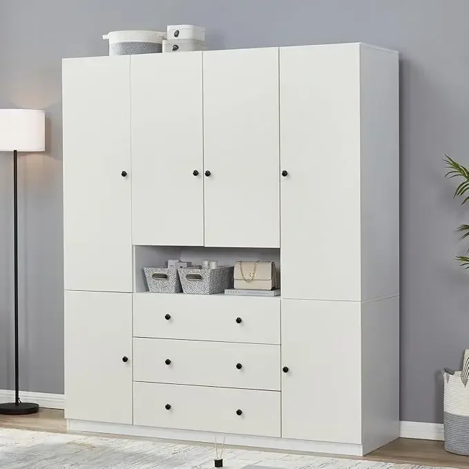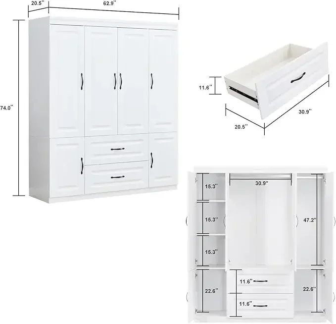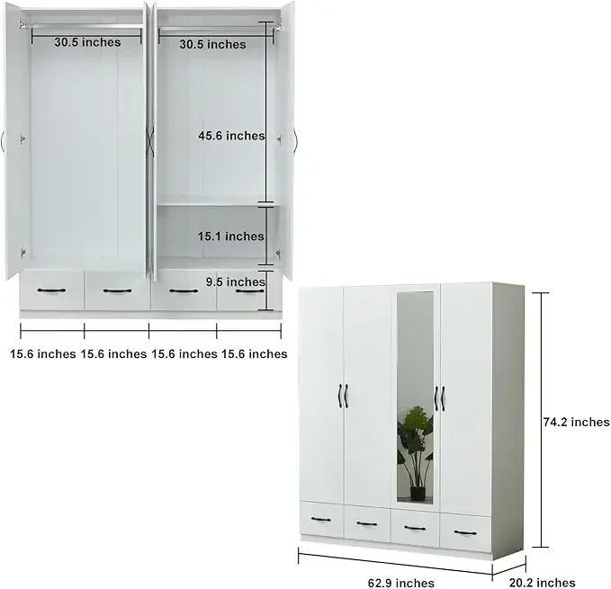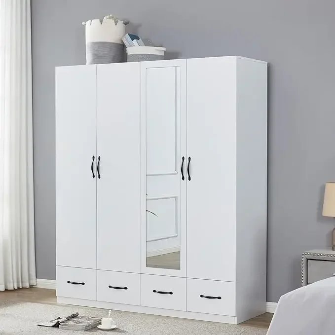 Armoire Wardrobe Closet with High Storage Capacity, Armoire Wardrobe Closet with Hanging Rod, 4 Doors 4 Drawers Wooden Wardrobe