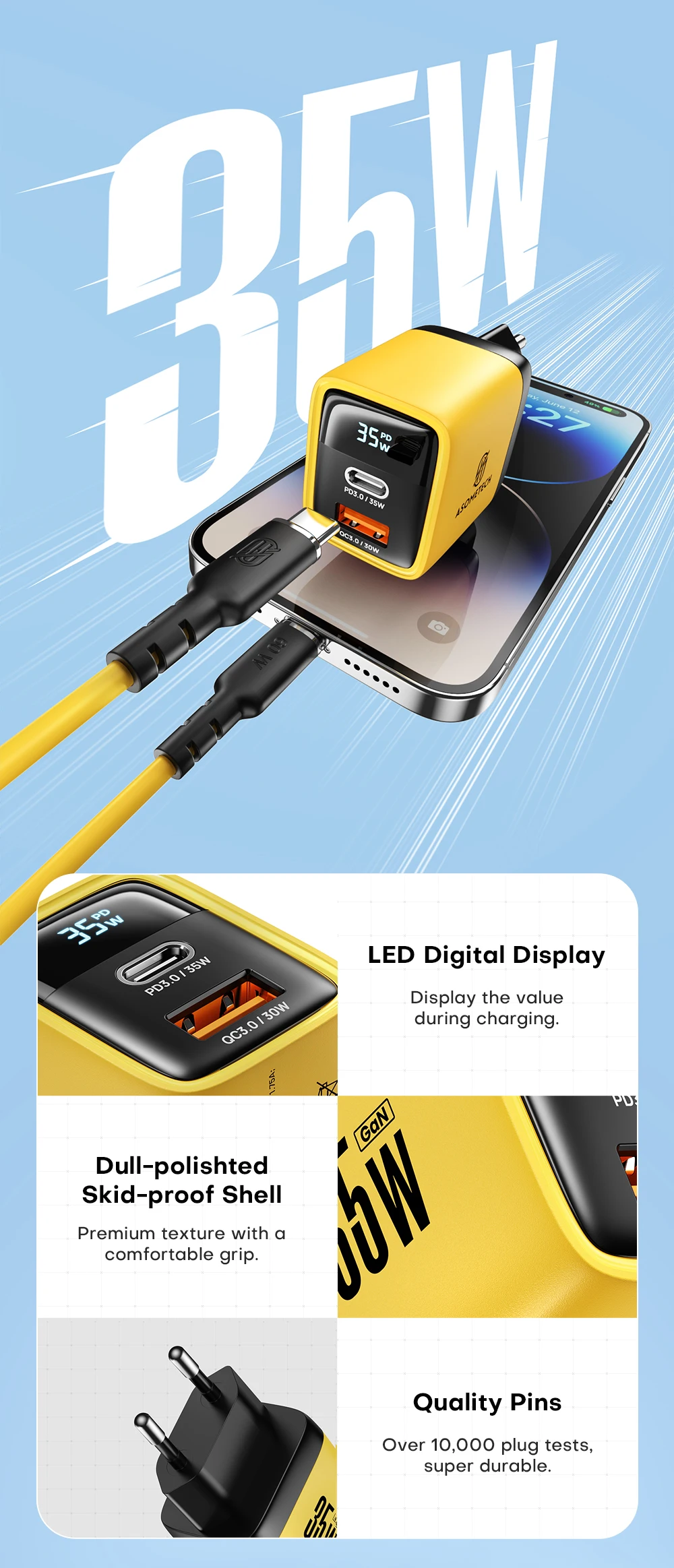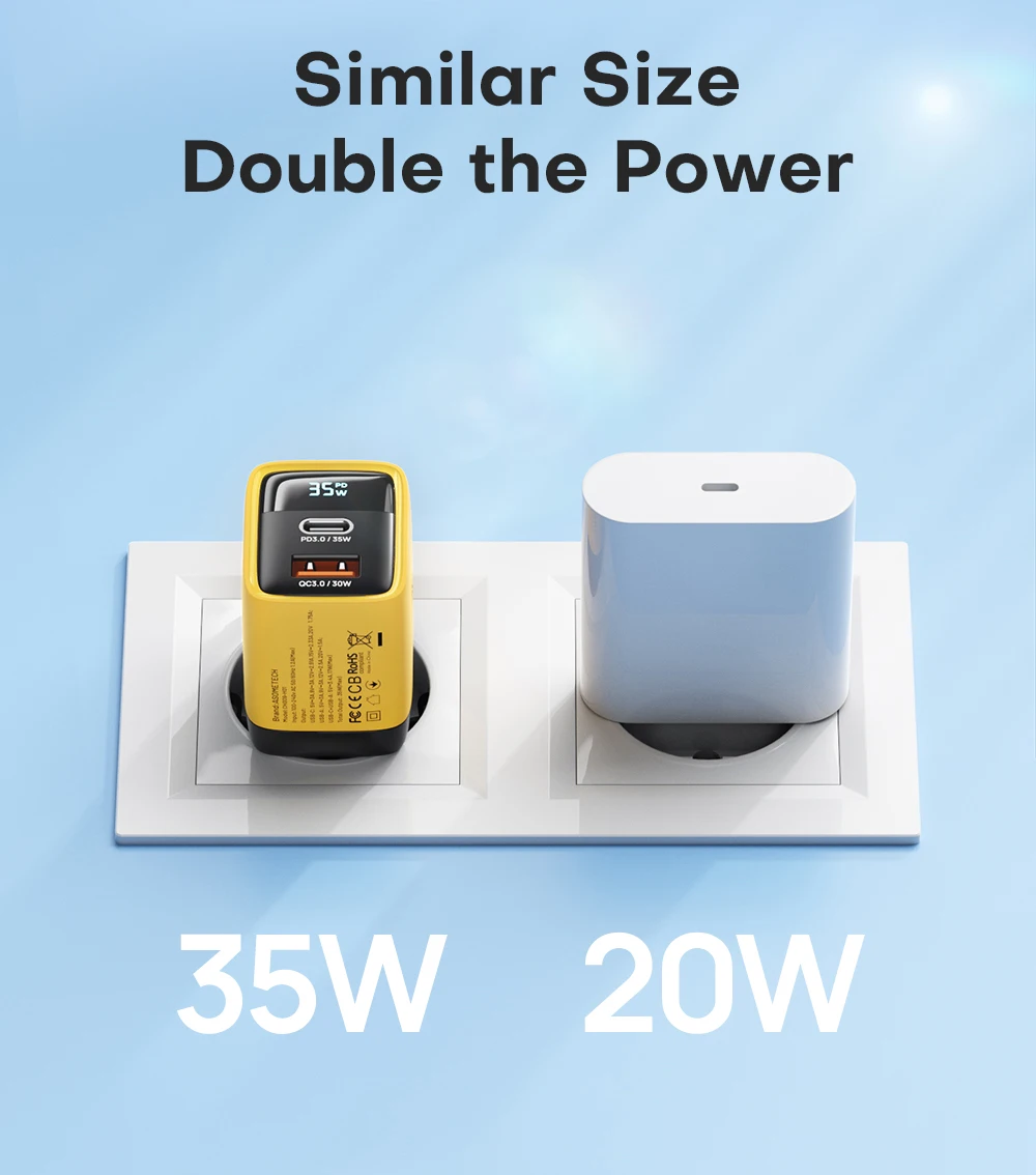 💪【LED Indicator + Digital Display】: ASOMTECH 35W charger with column LED indicator and LCD digital display, you can see the actual output power value when charging.
