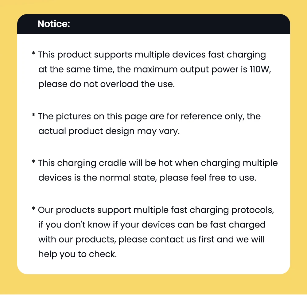 The fast charging capability of the charger is related to the model and software version of the device. Software upgrades of the device may affect the compatibility of the charger's fast charging. In actual use, the product will actually be compatible with more models, as there are too many models of devices, we can't give examples one by one, if you have questions, please contact us, we will be the first to answer them for you.