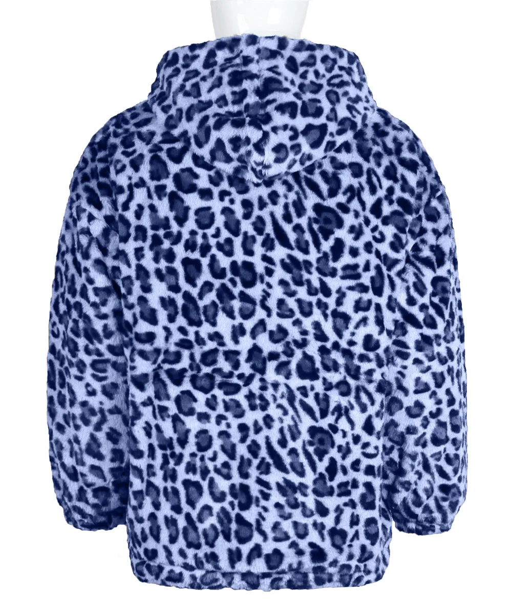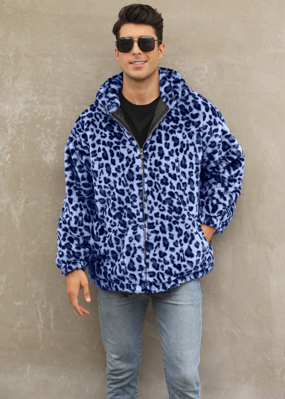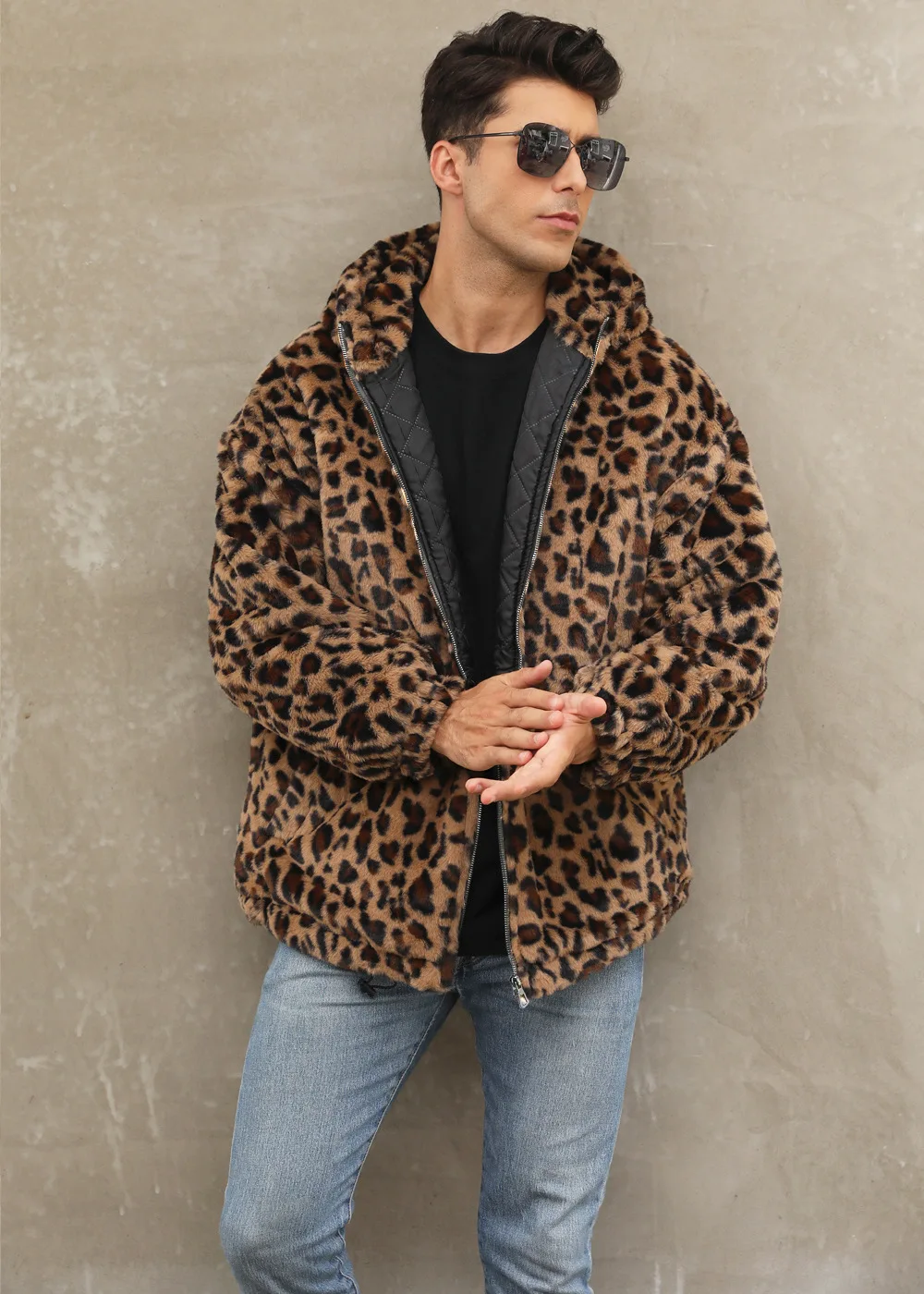 Autumn and Winter Warm Plush Leopard Print Jacket Imitation Fur Zipper Hooded Jacket for Men