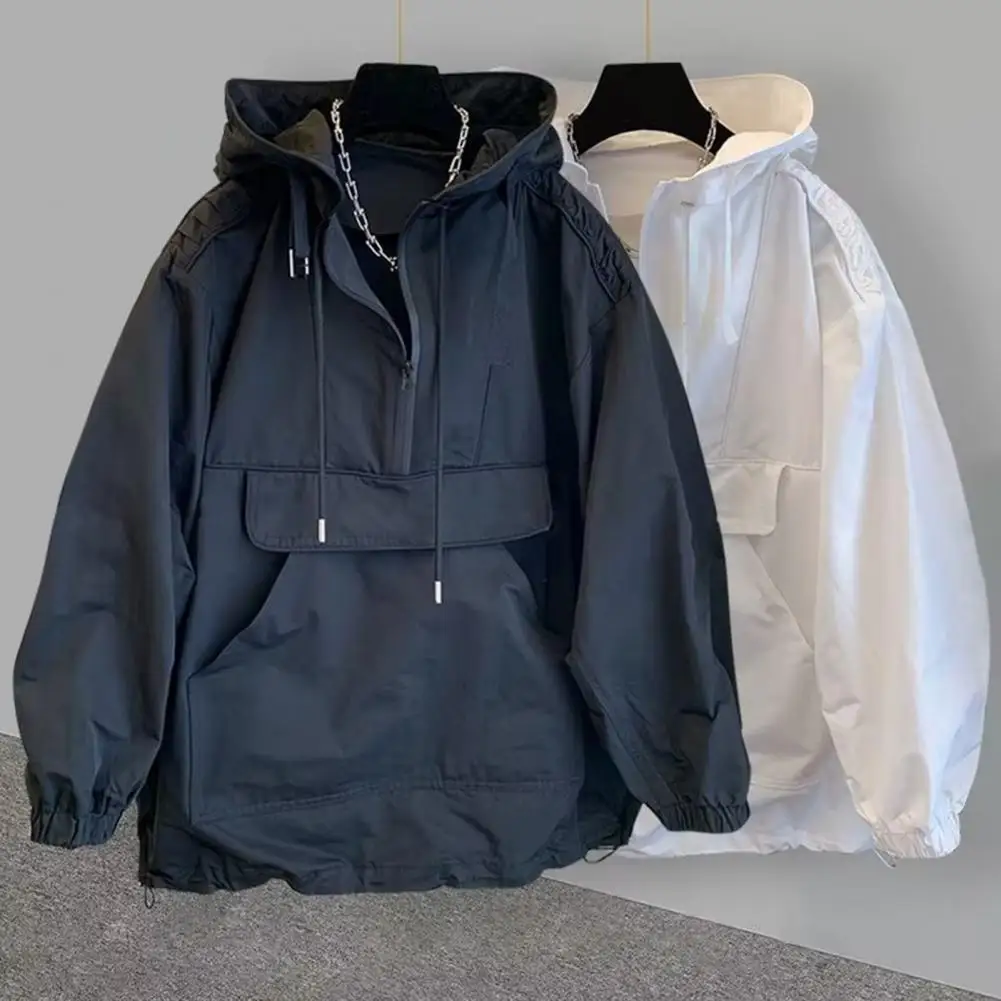 Autumn Hooded Casual Man Spring Jacket Solid Pockets Cargo Outdoor Sports Travel Tops Black Windbreak Half Zip Pullover Jacket