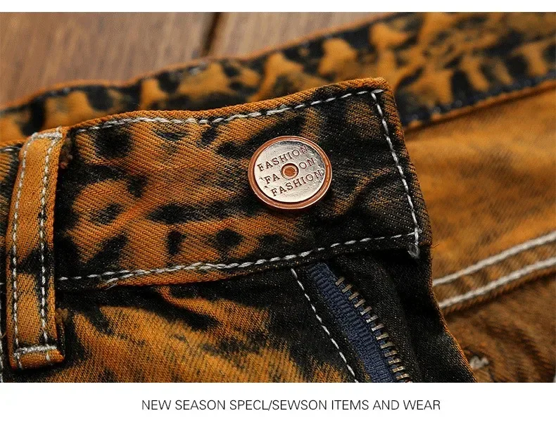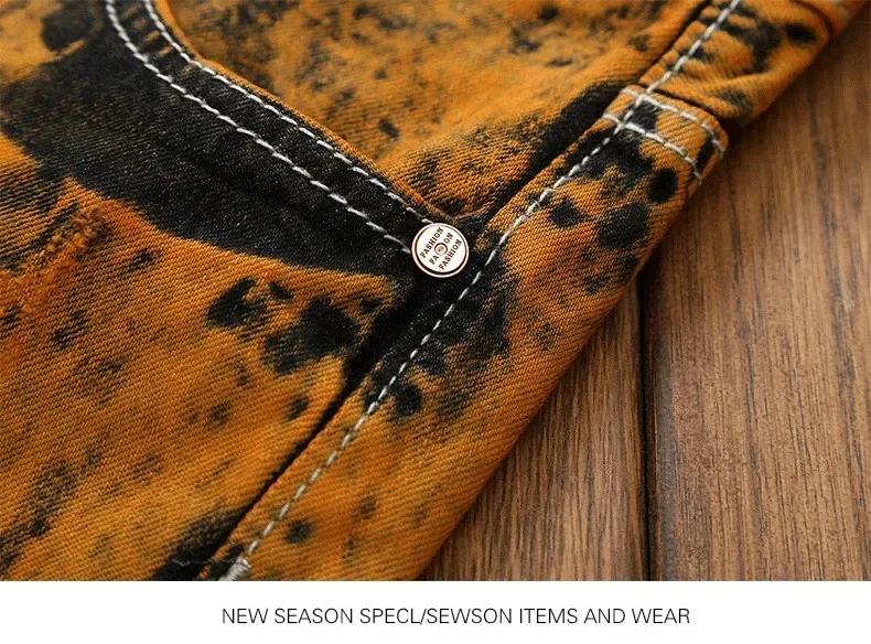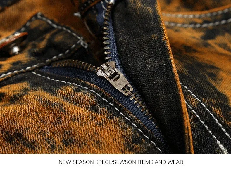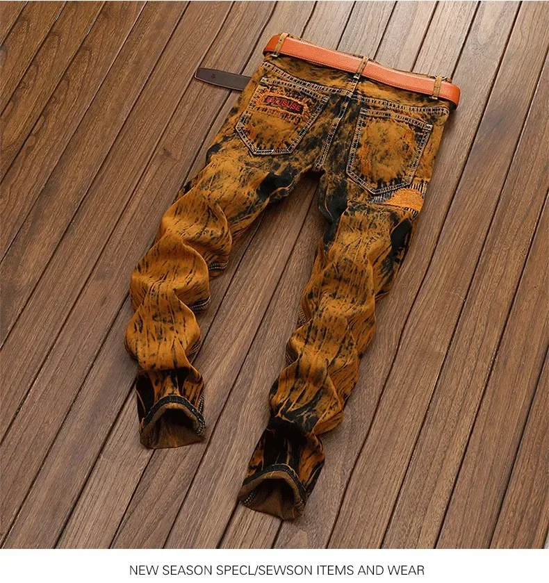 Autumn New Men’s Orange Ripped Patchwork Jeans (No Belt) Personalized Fashion Vintage Denim Trousers Motorcycle Streetwear Male
