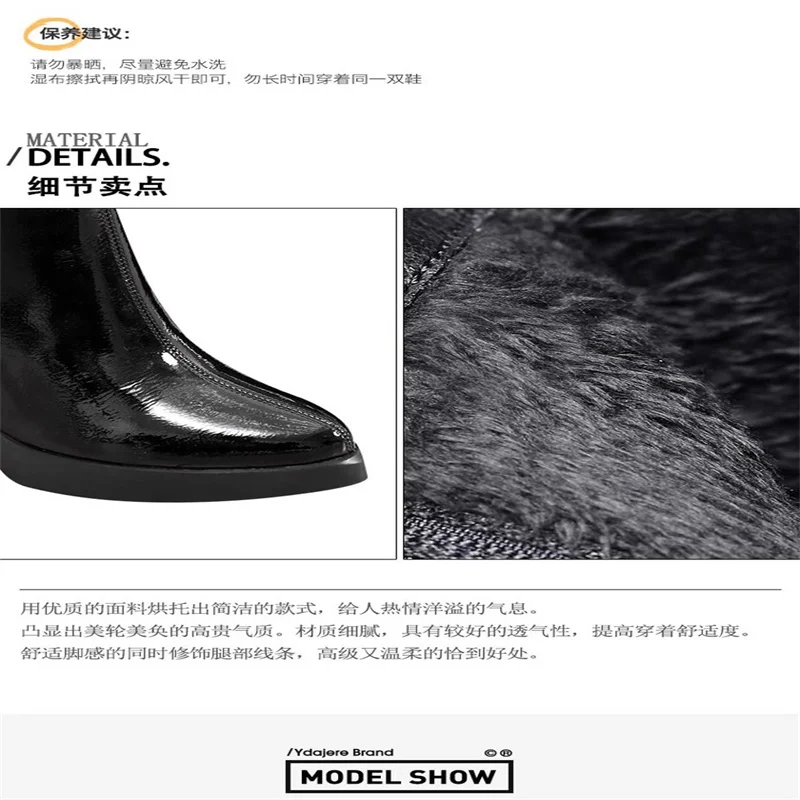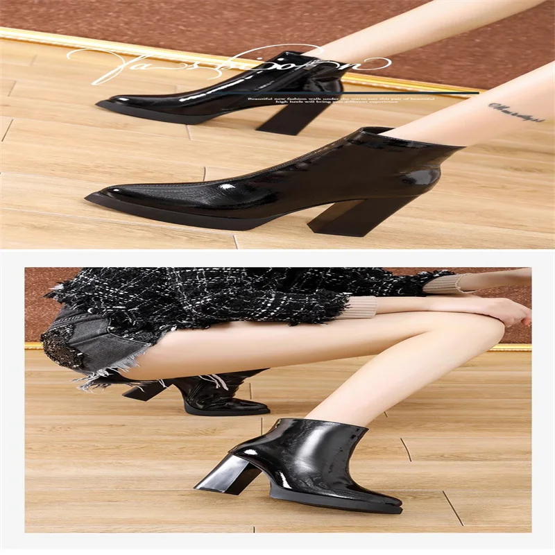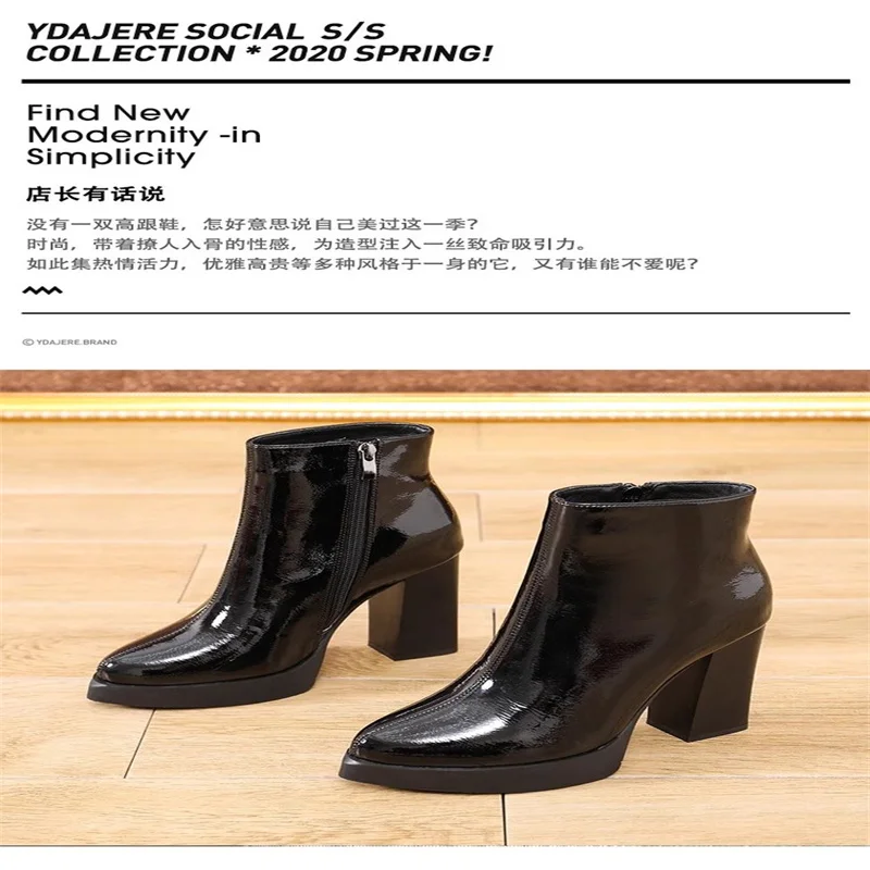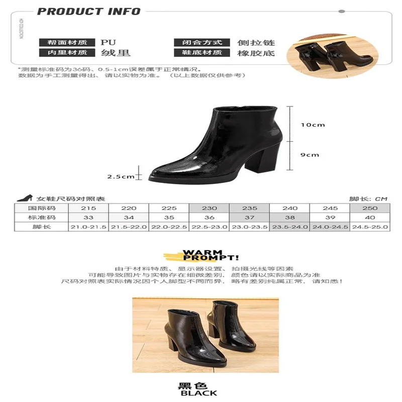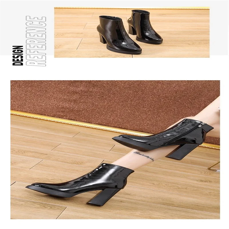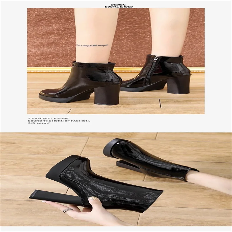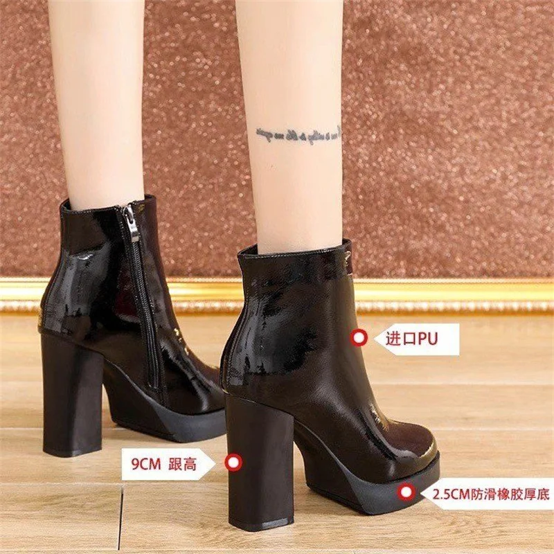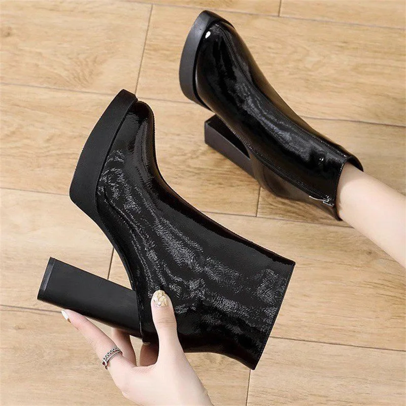 Autumn winter boots for women 2024 new round toe patent leather short boots slim and waterproof platform thick heels high heels