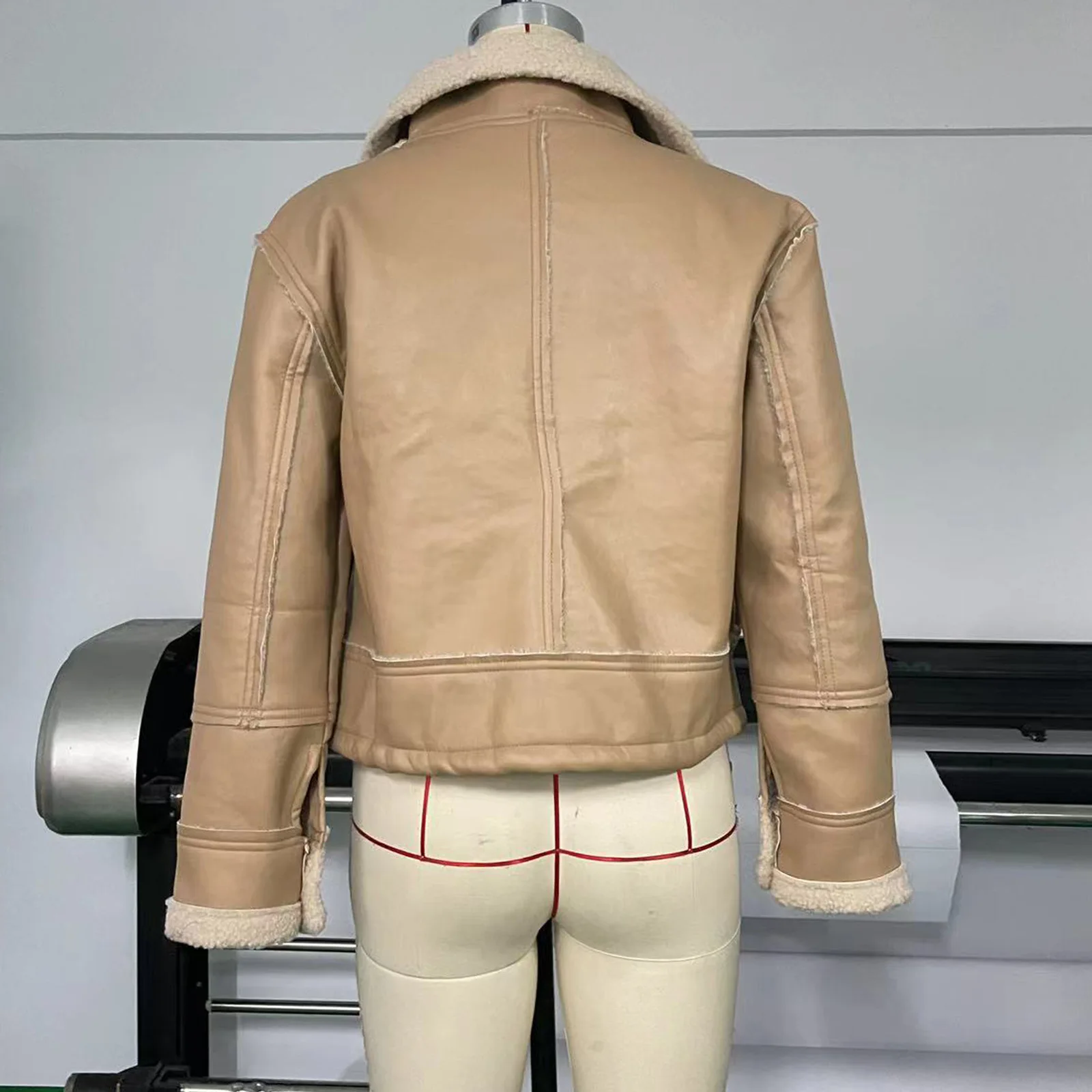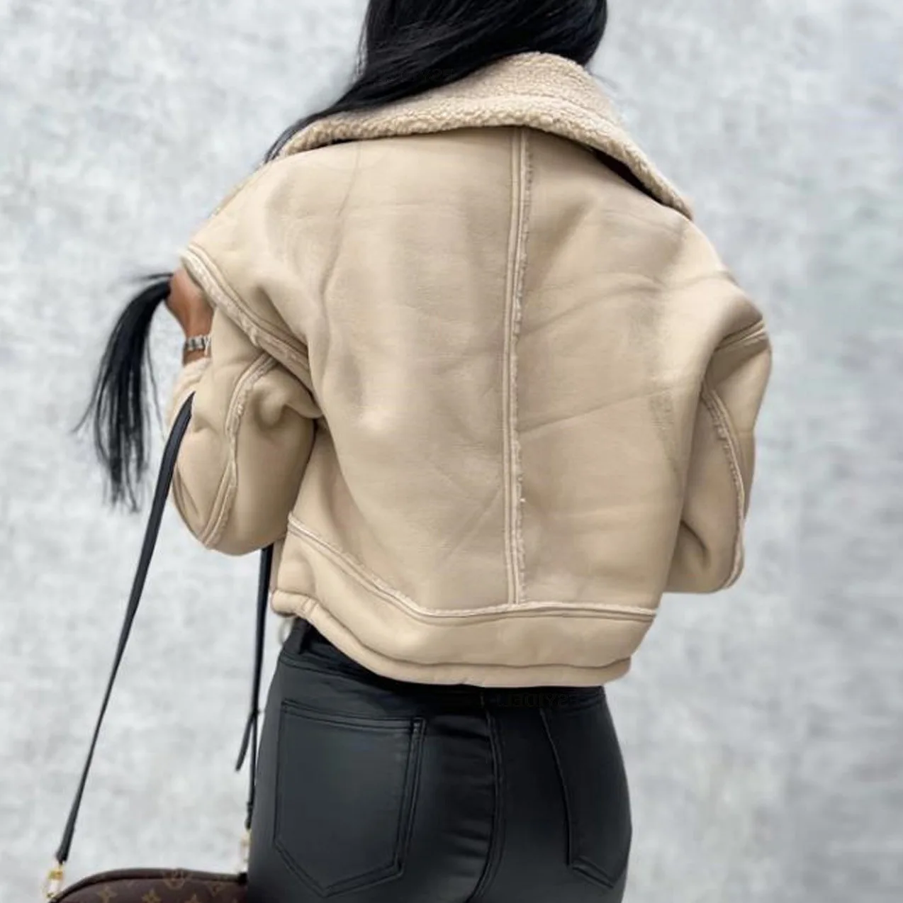 Autumn Winter Women Faux Leather Biker Jacket with Faux Fur Trimmed Collar Vintage Moto Coat Warm Winter Outerwear