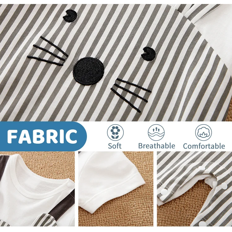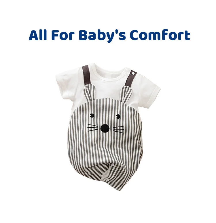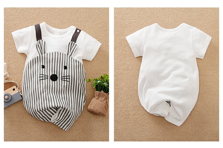 Baby Boy Girl Newborn Cute Cartoon Little Mouse Toddler Clothing Solid Color Fake Two-Piece Cotton Summer Short Sleeved Jumpsuit