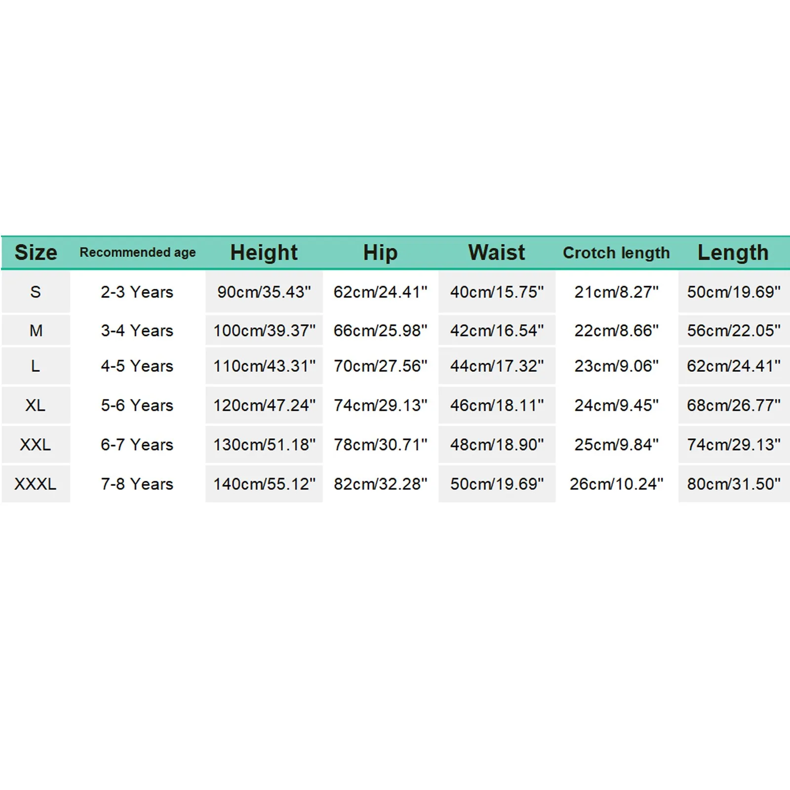 | Size:XXXL | Hip:82cm/32.28” | Waist:50cm/19.69” | Crotch length:26cm/10.24” | Length:80cm/31.50” | Height:140cm/55.12” | Recommended age:7-8 Years |