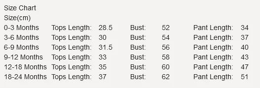 0-3 Months Tops Length: 28.5 Bust: 52 Pant Length: 34