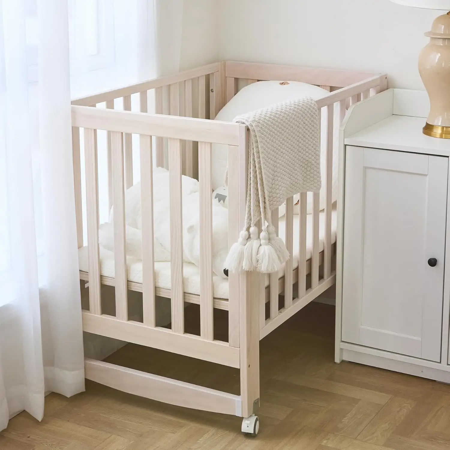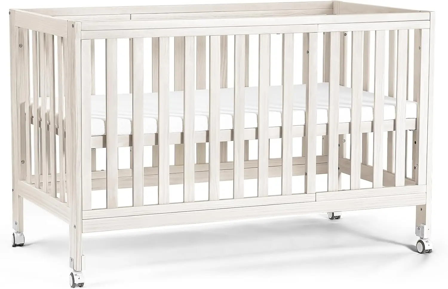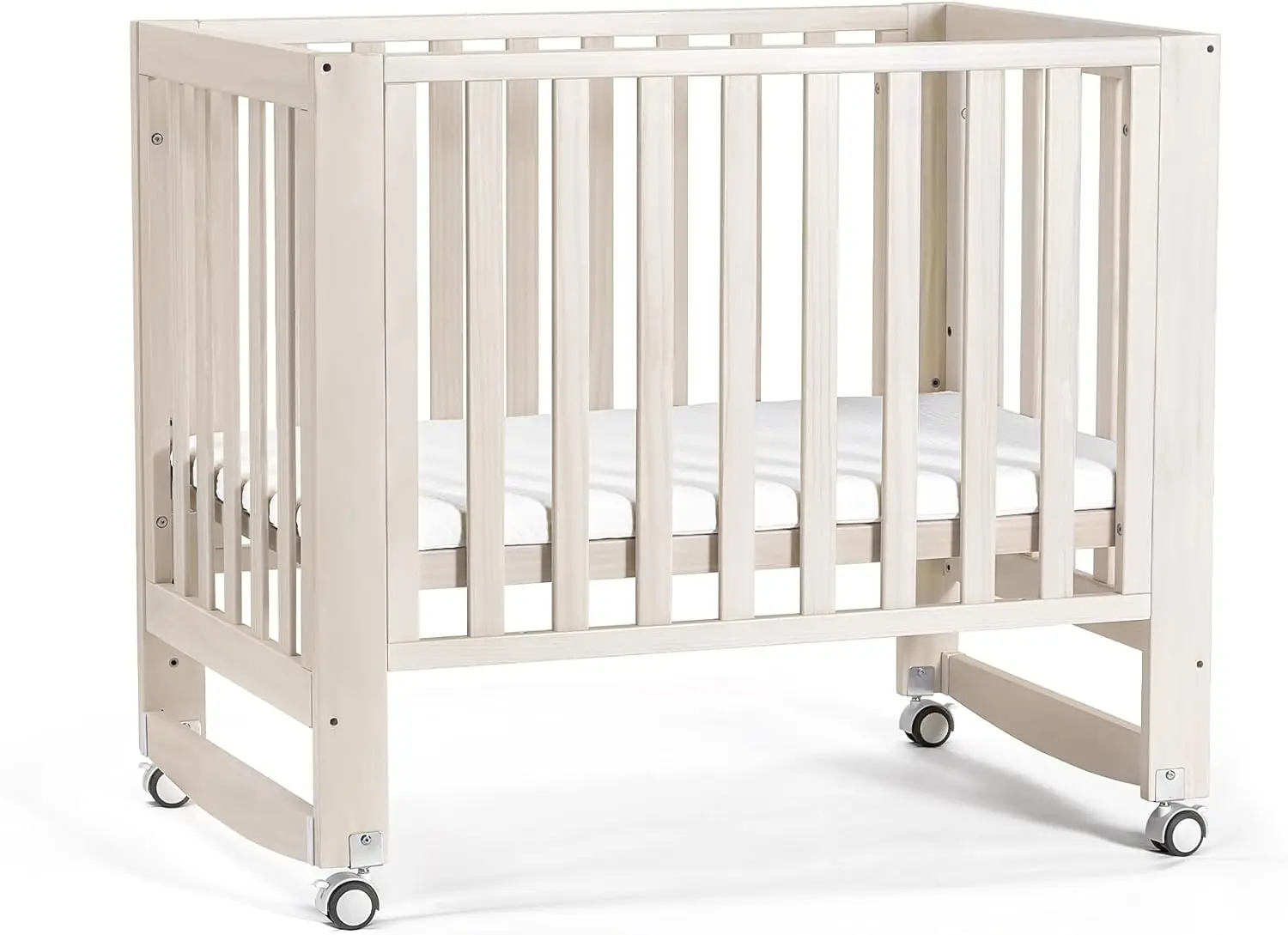 Baby Crib, 6 in 1 Convertible Mini Crib with Wheels,New Zealand Pinewood Bed, 4 Adjustable Mattress Heights