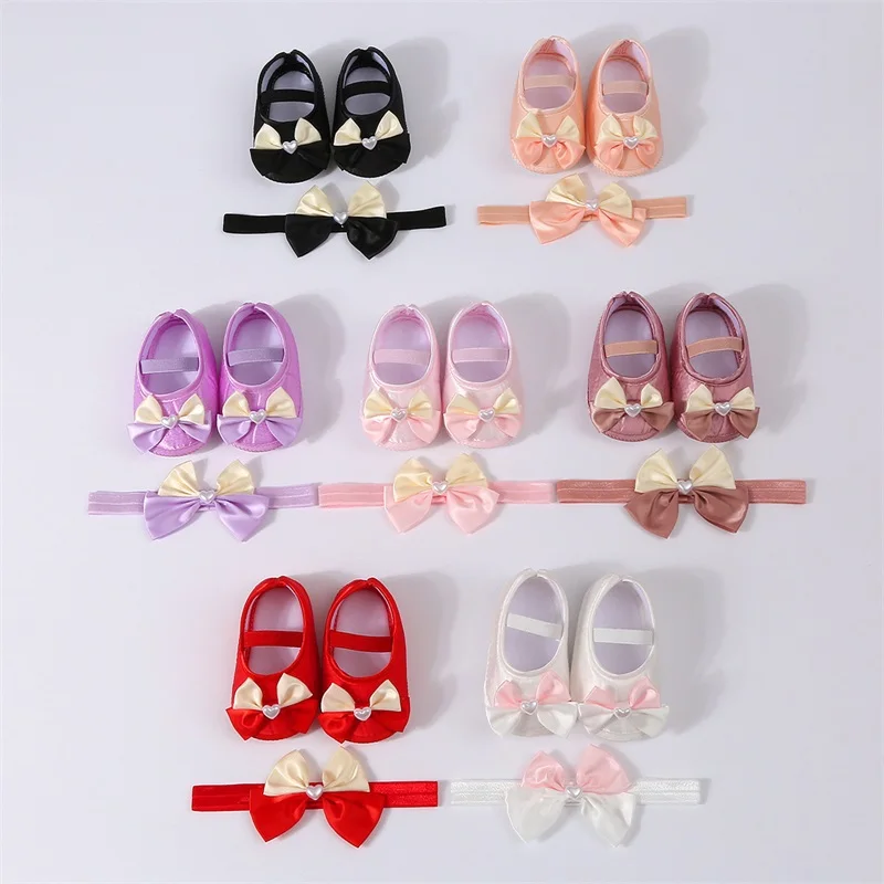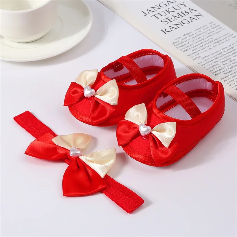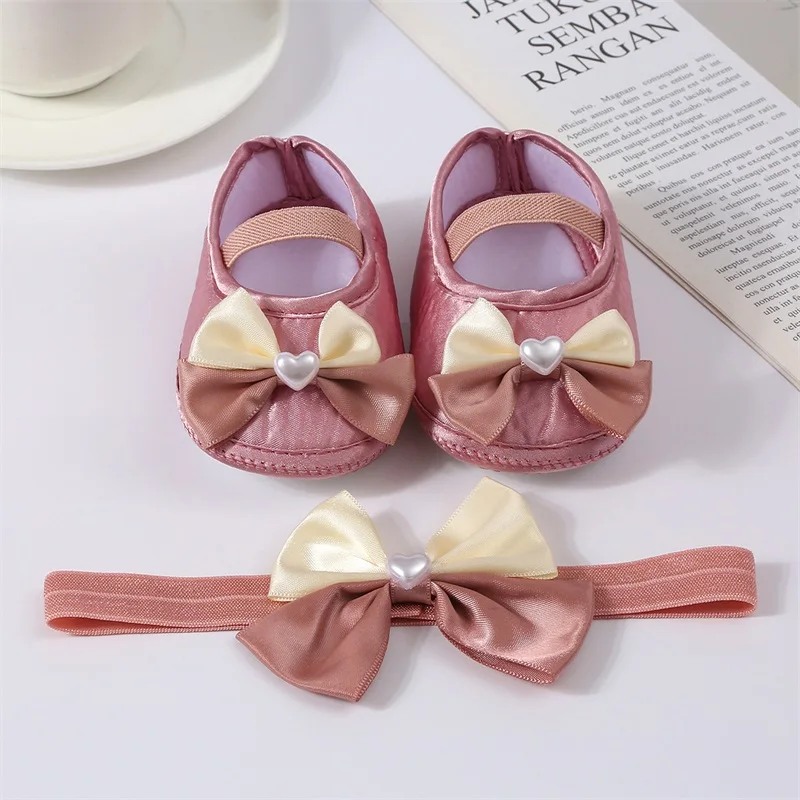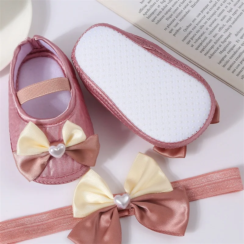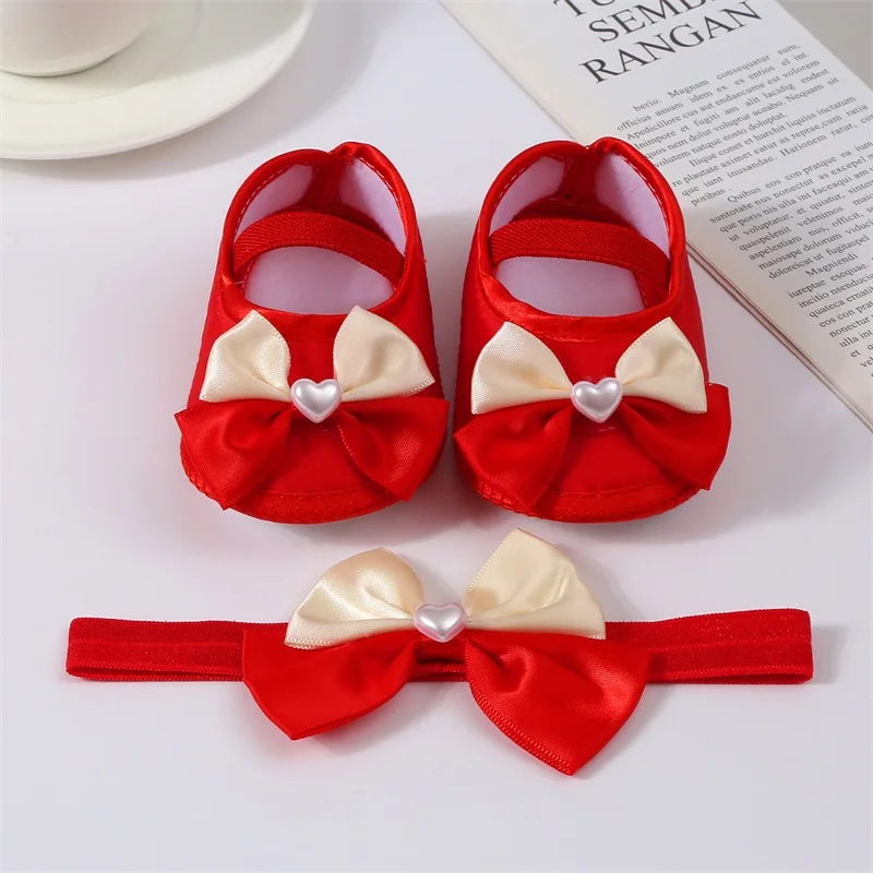 Baby Girls Baptism Shoes and Headband Cute Heart Pearl Bowknot Flats Crib Shoes and Hairband Set for Infants Toddlers