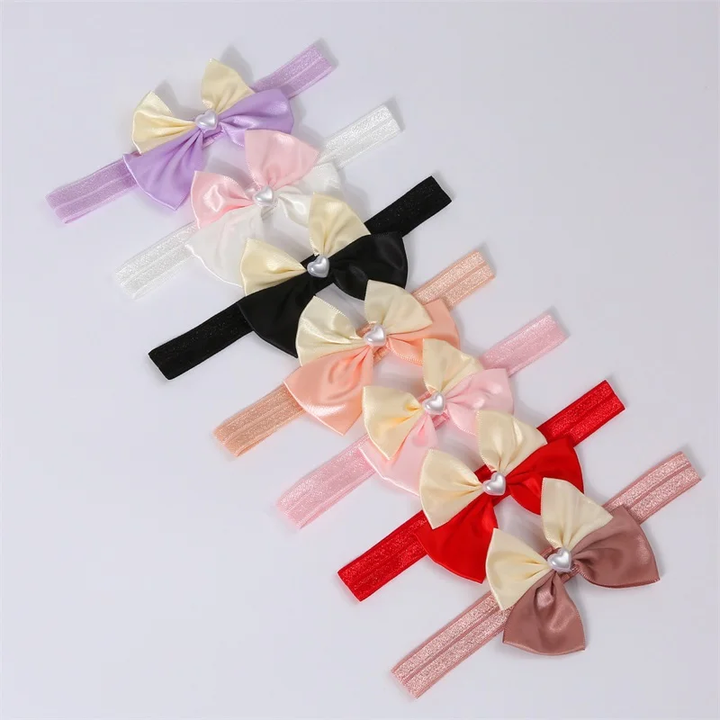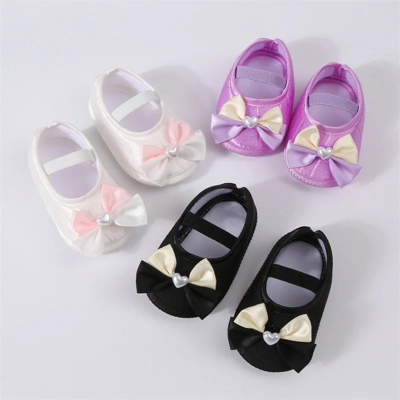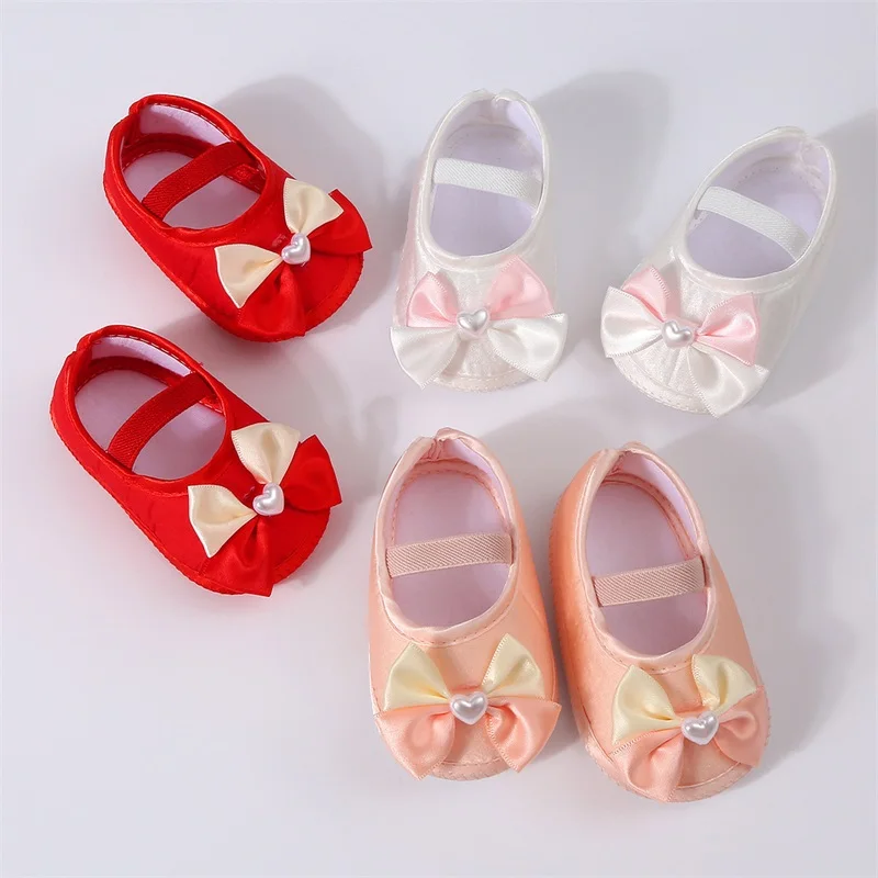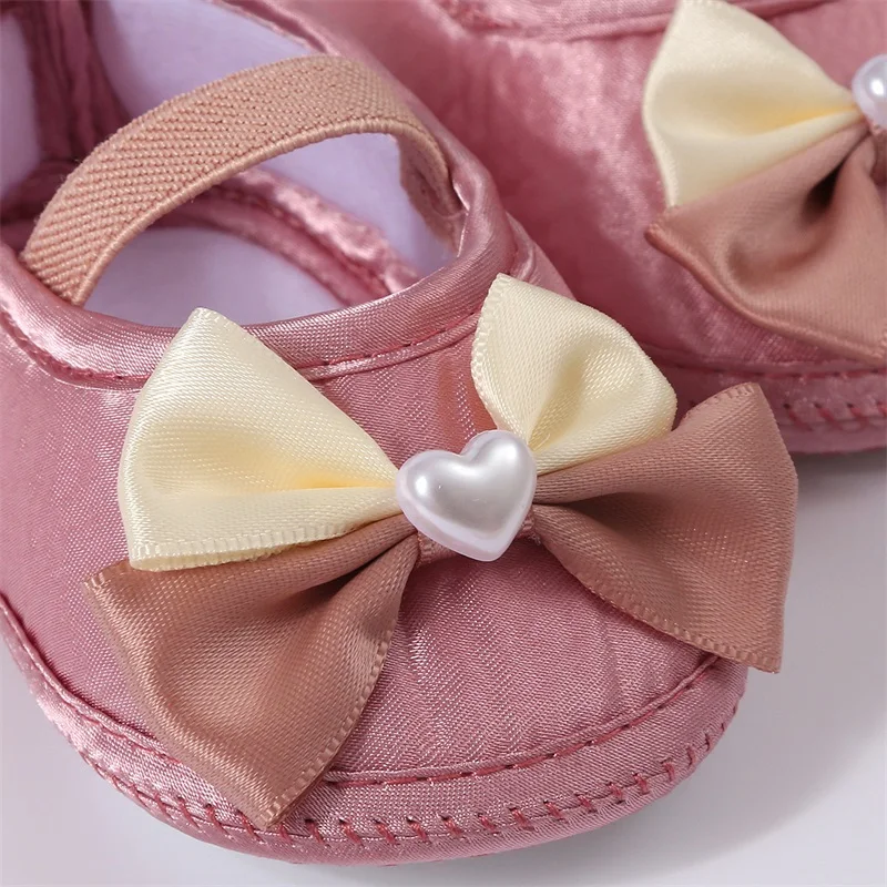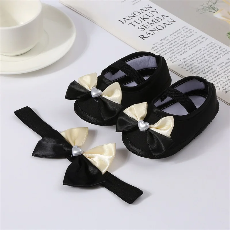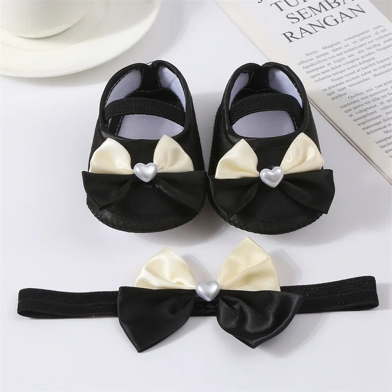 Baby Girls Baptism Shoes and Headband Cute Heart Pearl Bowknot Flats Crib Shoes and Hairband Set for Infants Toddlers