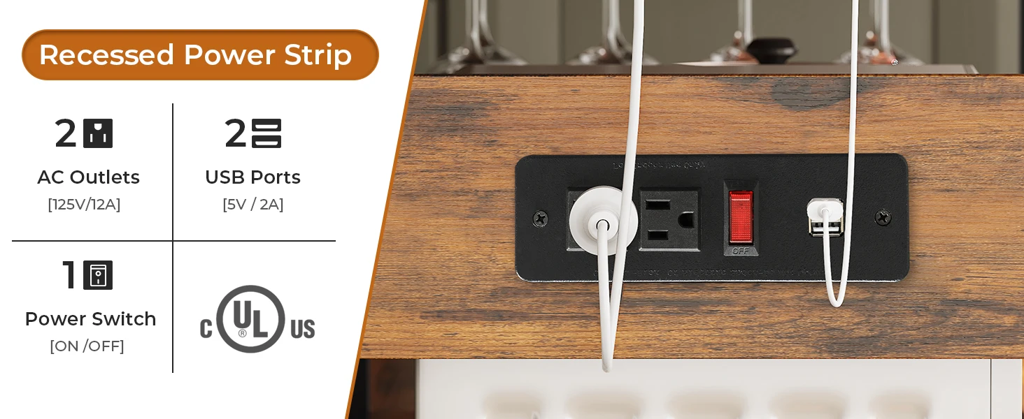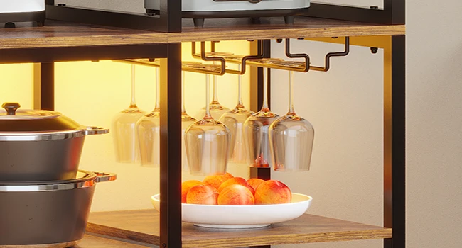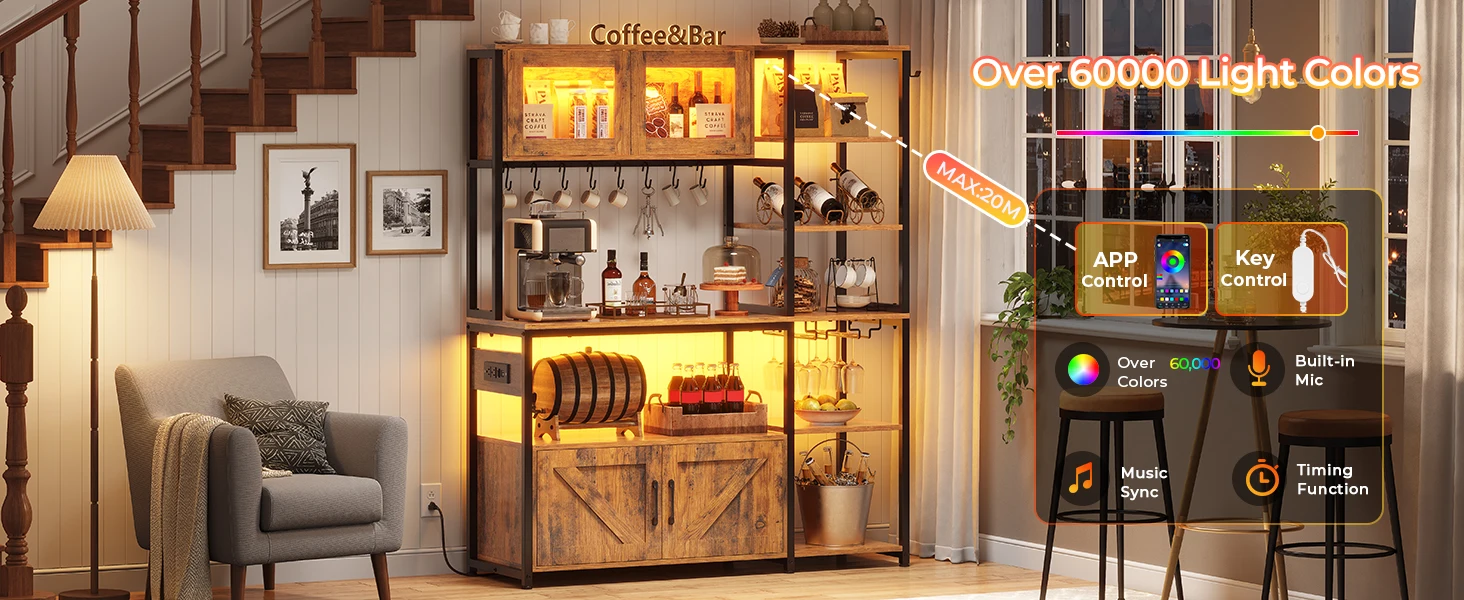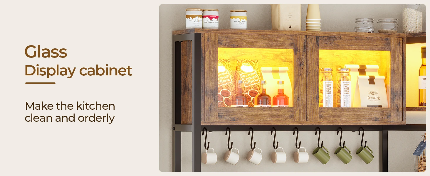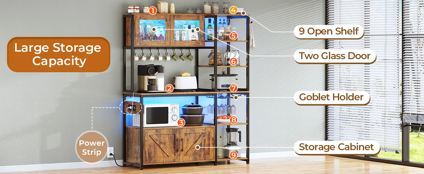 Bakers Rack with Power Outlet and LED Light, 45.3 Inch Farmhouse Coffee Bar Cabinet, Kitchen Microwave Stand with Storage, Glass
