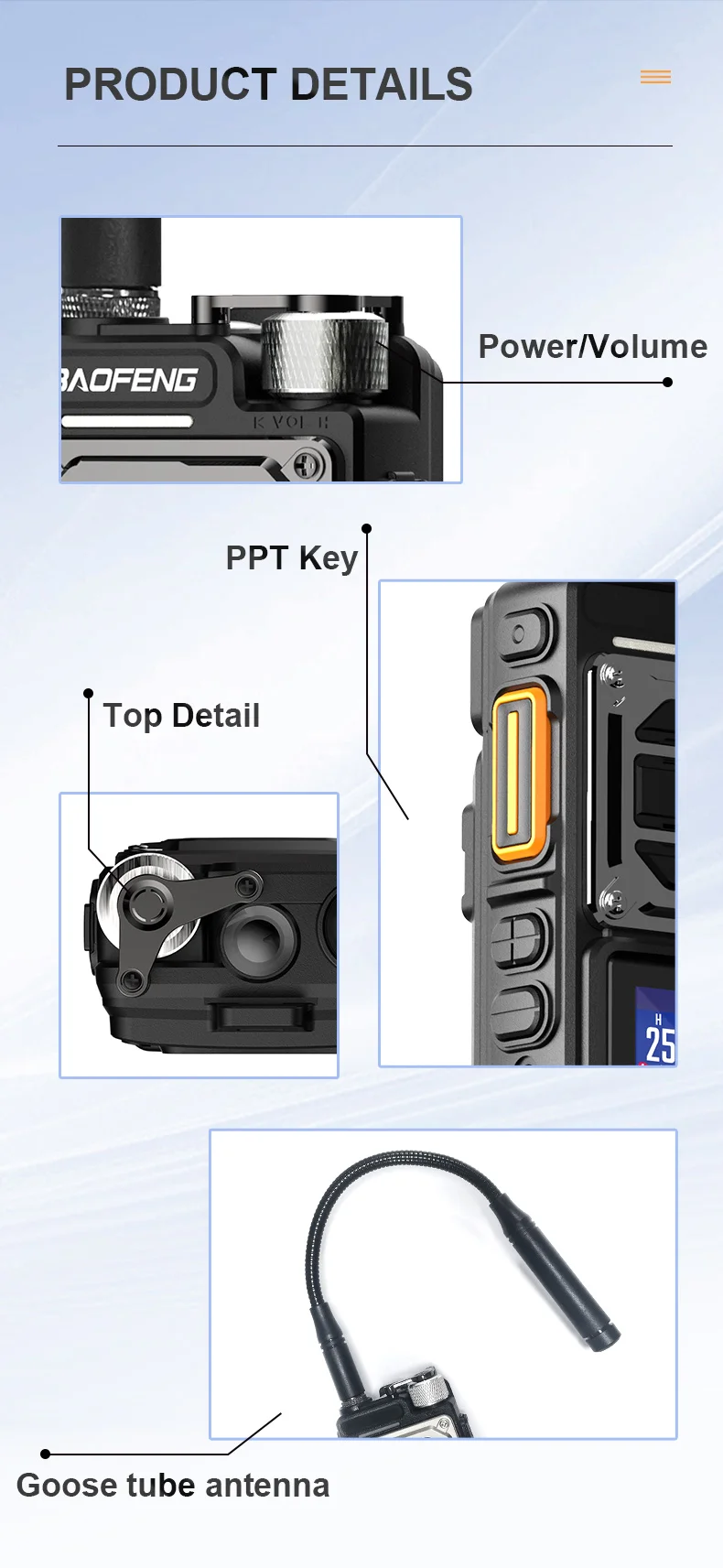 – Ten (10) levels of Squelch adjustment.