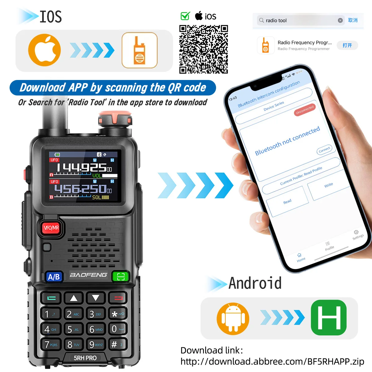 IOS: Scan the QR code in the image to download or enter the mobile app store, search for "Radio Tool" and find the app to download.