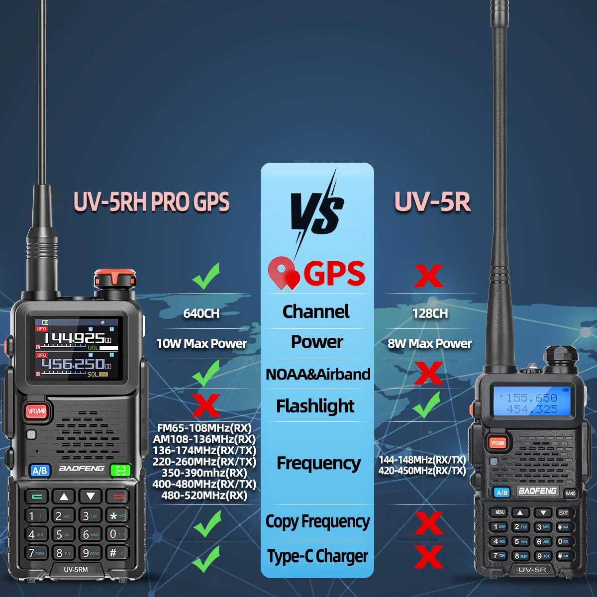 Baofeng UV-5RH PRO GPS Walkie Talkie Multi Band Wirless Copy Frequency NOAA Type-c Long Range UV-5R Tow Way Ham Radio